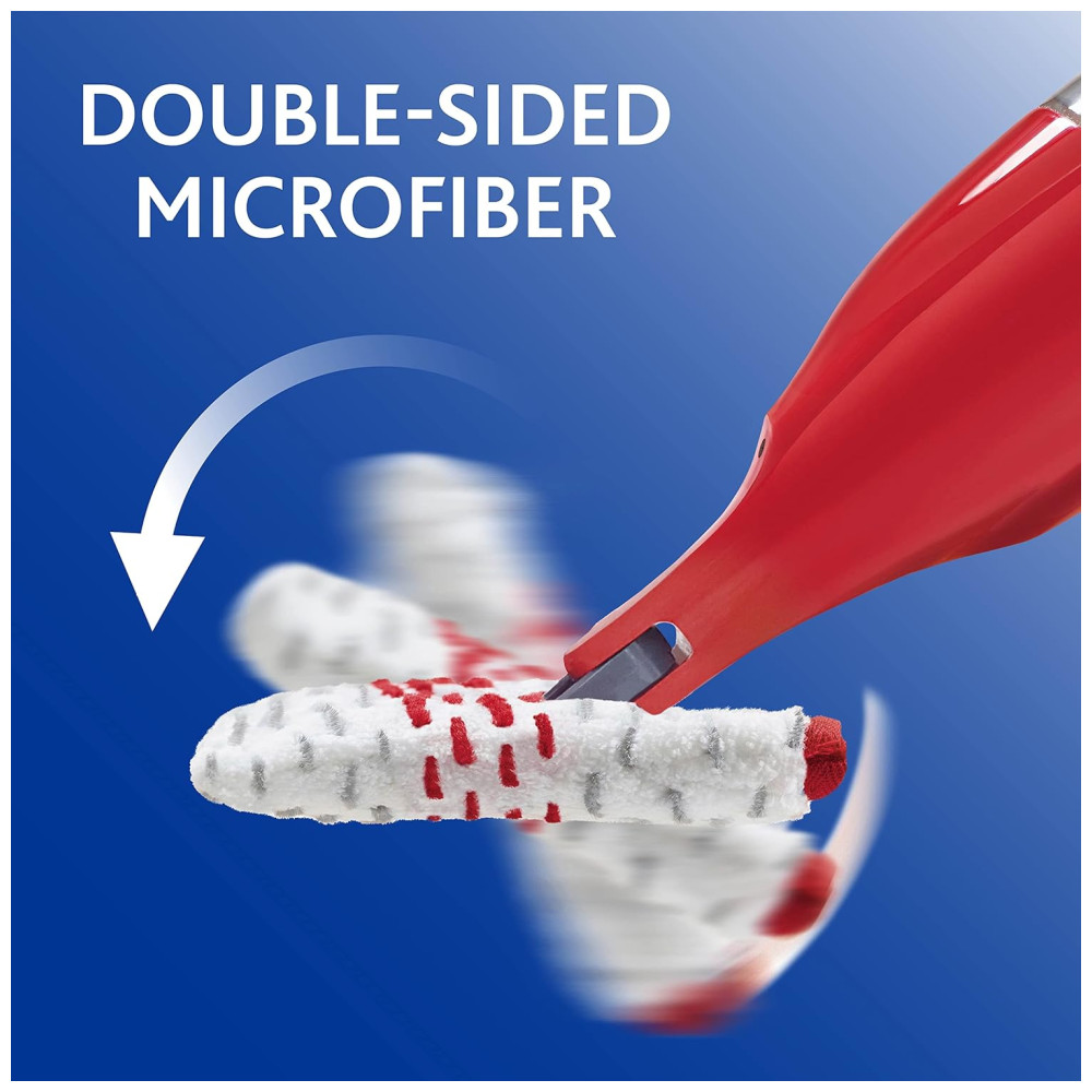 PAD DE DOIS LADOS A grande cabeça de microfibra de dois lados gira 180 graus, permitindo que você limpe o dobro da cobertura do piso sem ter que parar e trocar o esfregão A almofada de microfibra versátil permite que você use molhado para uma limpeza mais profunda para dar brilho ao seu piso ou use seco para fins de limpeza.