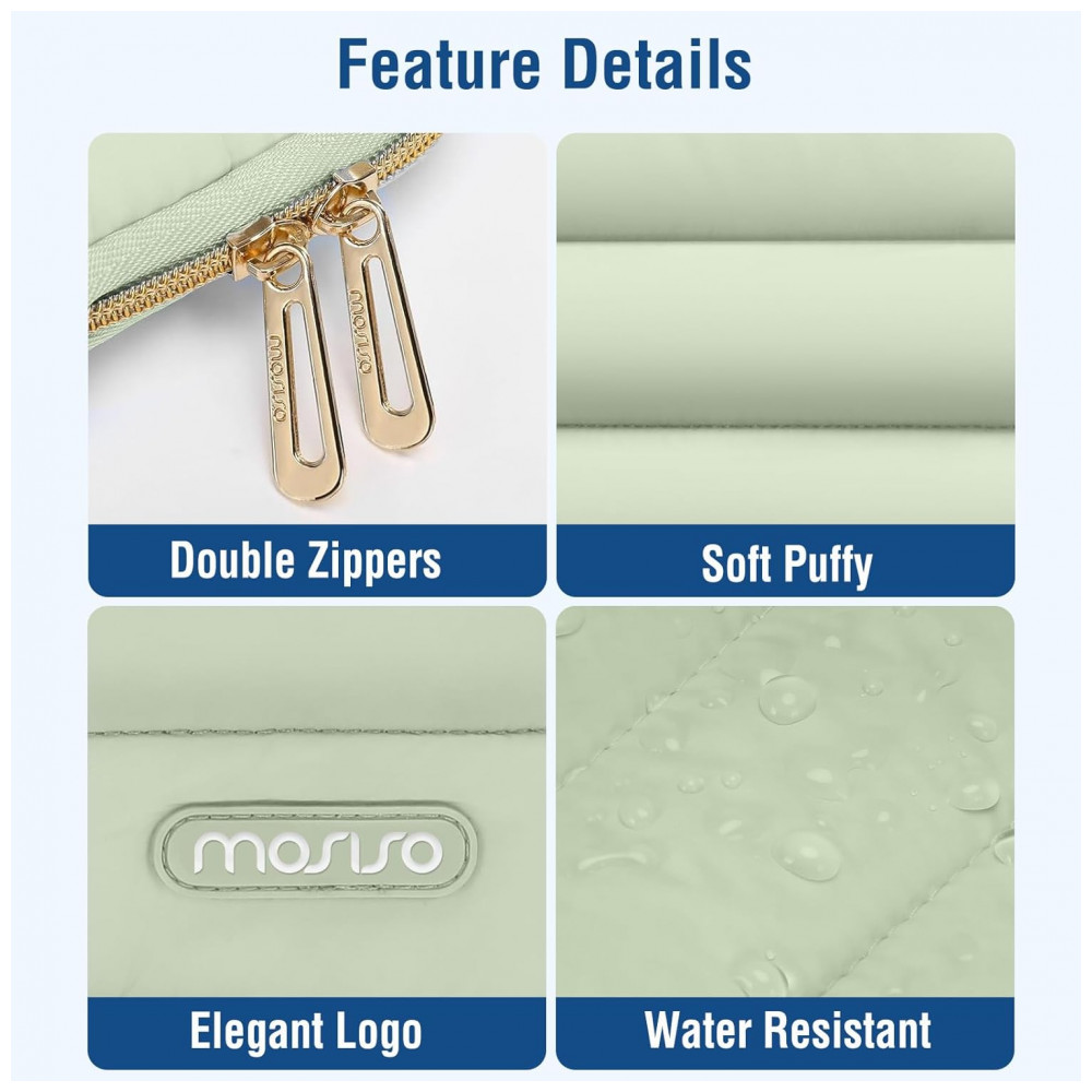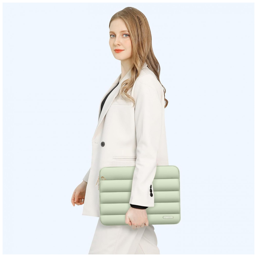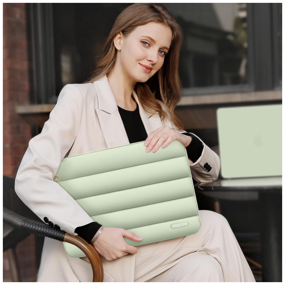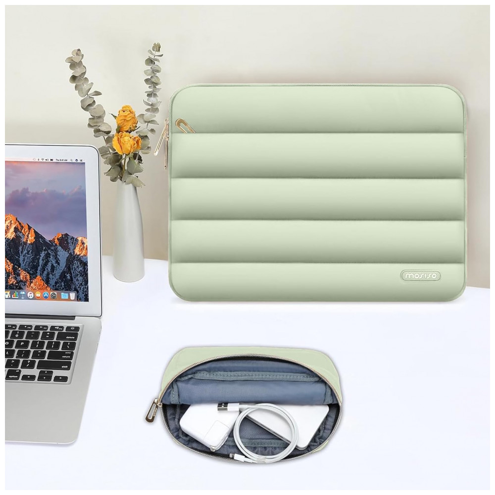 A MOSISO 13.3” Verde-Sálvia é uma bolsa acolchoada que une proteção, funcionalidade e design elegante, ideal para laptops de 13 a 13,3 polegadas. Produzida em poliéster macio tipo puffy, a sleeve possui uma camada interna de espuma e forro felpudo que protegem contra impactos, choques e arranhões acidentais. O bolso frontal horizontal de 11,61 x 7,48 polegadas é perfeito para guardar acessórios como cabos, carregadores e documentos, enquanto o estojo pequeno incluído (7,87 x 4,33 x 1,38 polegadas) permite armazenar mouse, fones de ouvido ou outros itens, mantendo a harmonia de cores com a bolsa principal.
