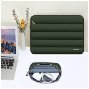 A capa acolchoada MOSISO para laptops de 13 a 13,3 polegadas em Verde Militar combina proteção, elegância e praticidade. Confeccionada em poliéster puff macio, com camada de espuma e forro felpudo, oferece excelente absorção de impactos, protegendo o laptop contra choques, arranhões e uso diário.