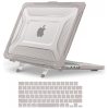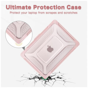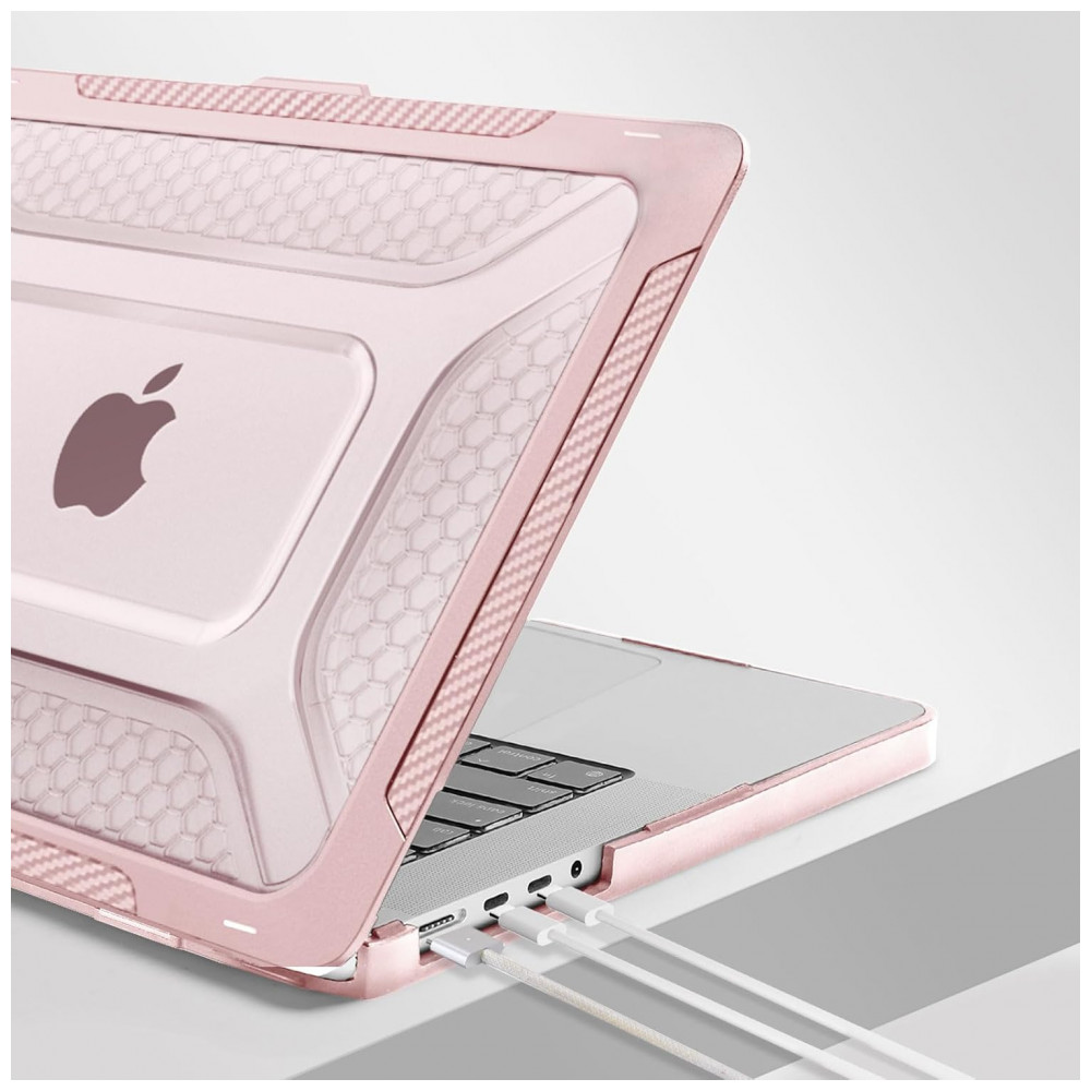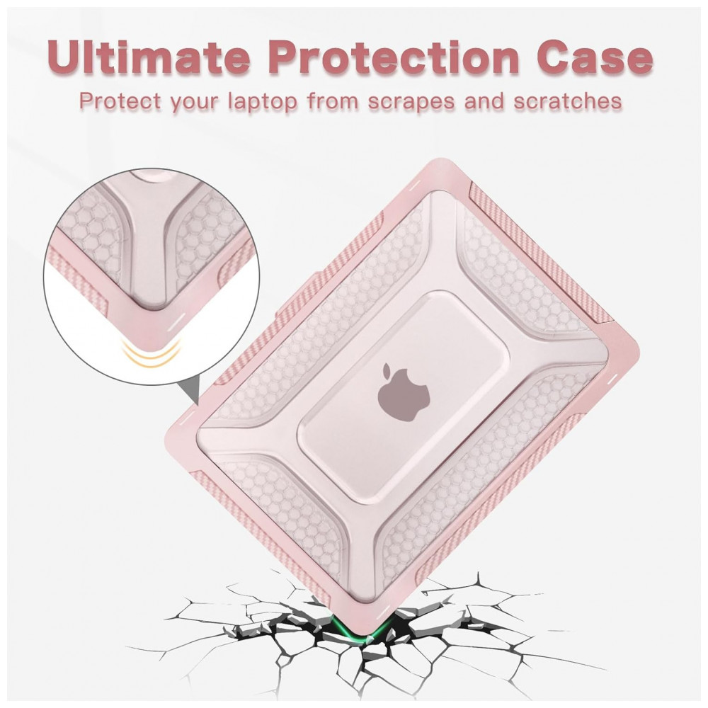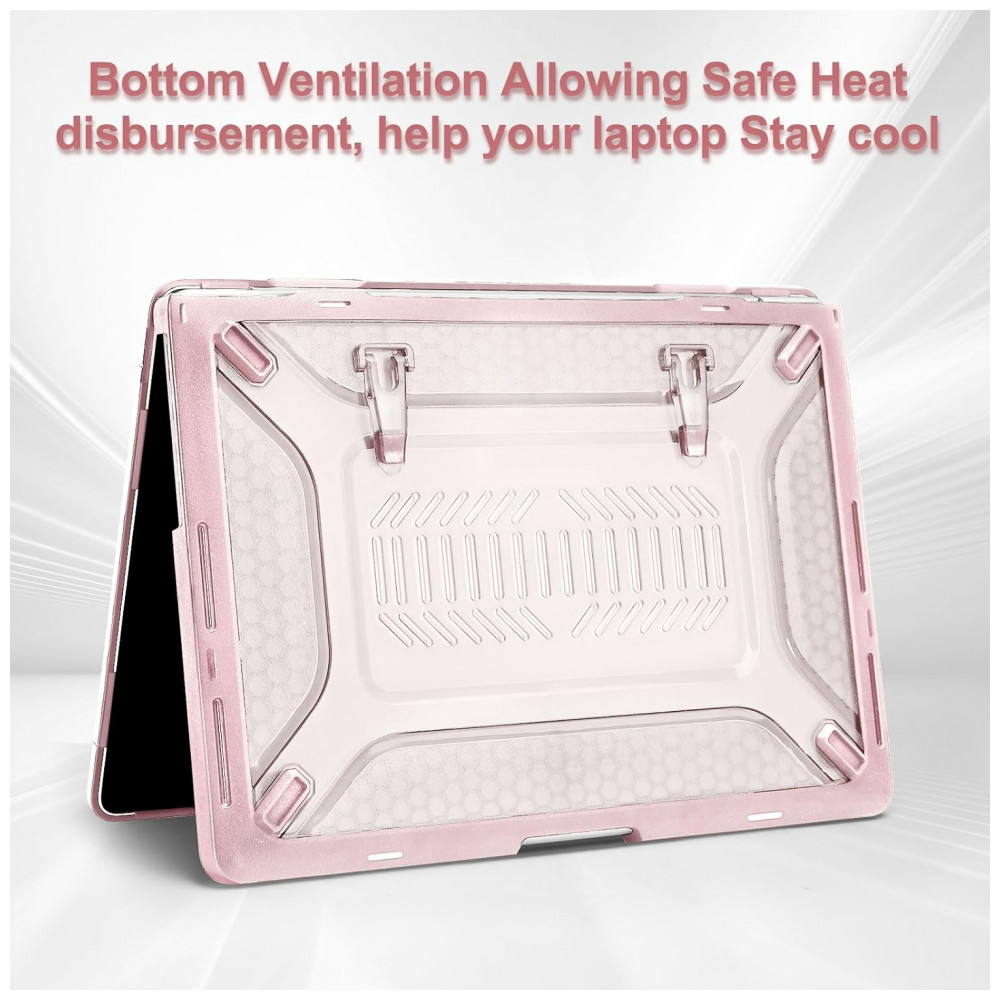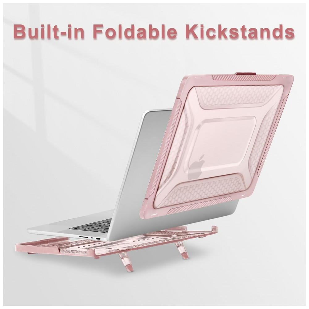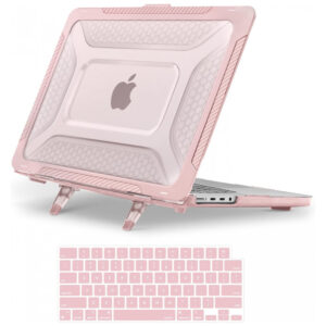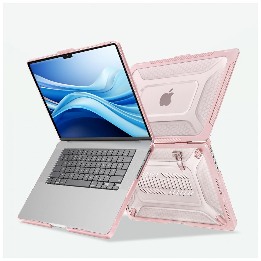 O design com bumper em TPU Honeycomb absorve impactos e distribui choques, enquanto o suporte dobrável integrado oferece um ângulo ergonômico ideal para visualização e digitação. A capa é totalmente ventilada para dissipação de calor e permite acesso completo a todos os botões e portas do MacBook. Totalmente removível, não oferece risco de danificar o laptop durante a aplicação.