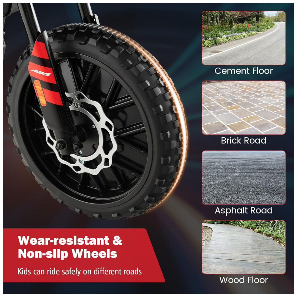 Facilidade de Condução: A motocicleta infantil é projetada para ser fácil de dirigir. Basta ligar o botão liga, desliga, selecionar a velocidade e pressionar o botão Avançar.