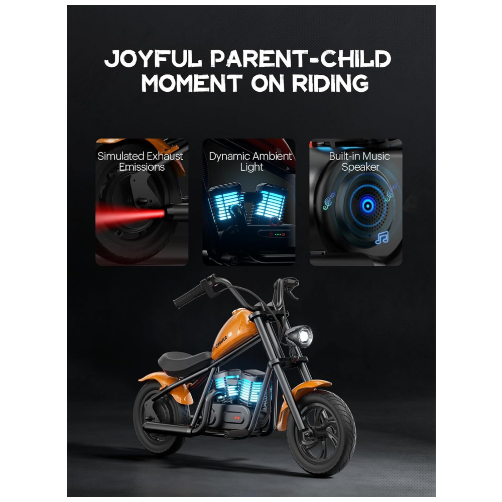 Descubra a magia dos efeitos da neblina: A moto elétrica infantil CHALLENGER 12 Plus apresenta um recurso inovador de simulação de neblina, mergulhando os jovens pilotos em uma jornada autêntica e atmosférica. Este efeito cativante eleva a aventura de pilotagem, permitindo que as crianças aproveitem cada momento na estrada.