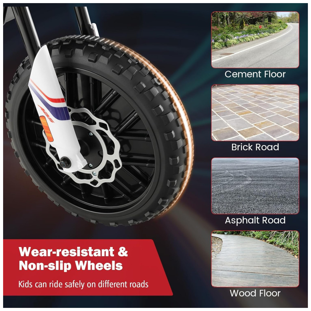 Múltiplas funções atraentes a bicicleta elétrica infantil vem com música embutida, um interruptor de mudança de velocidade, um botão Iniciar e USB, slot para MP3 que permite reproduzir sua própria música. Várias funções interessantes aumentam muito a diversão de dirigir.