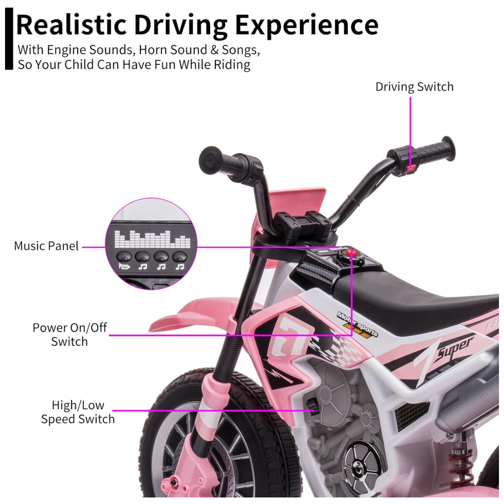 EXPERIÊNCIA DE MONTAGEM REALISTA Ligue primeiro o botão liga , desliga geral e o passeio de moto avança através do botão no guidão, como um quadriciclo real Além disso, tentamos torná lo ainda mais realista com duas velocidades, sons do motor, som da buzina e músicas, para que seu filho possa se divertir enquanto anda.