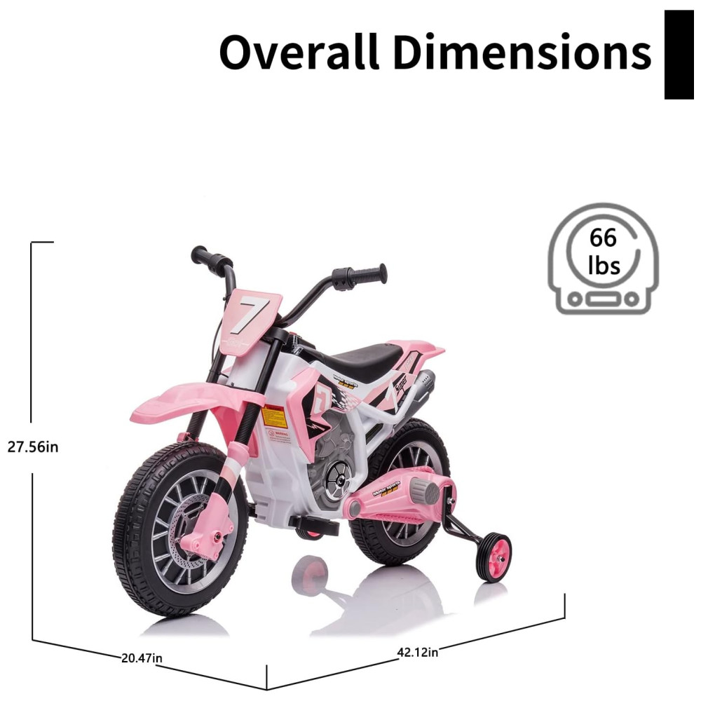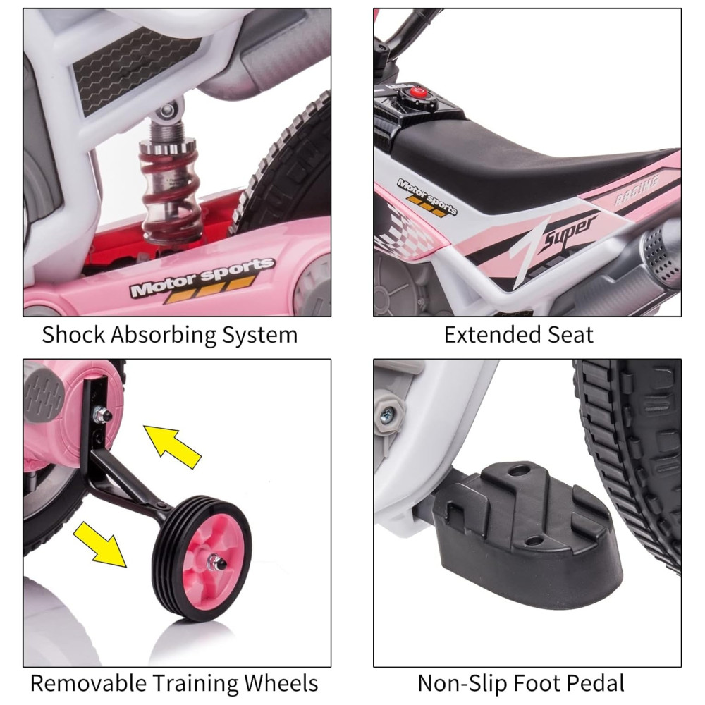 RODAS DE FORMAÇÃO PARA SEGURANÇA MAIS ALTA Existem 2 rodas de treinamento removíveis que mantêm a bicicleta elétrica de sujeira o mais estável possível para permitir maior segurança. Motive seu filho para ficar com este divertido e emocionante veículo de brinquedo. Não se esqueça de desconectar as rodas de treinamento para obter uma direção mais suave quando o seu filho estiver pronto para desfrutar de dirigir uma moto elétrica. Além disso, a motocicleta foi projetada com mola de absorção de choque, garantindo que ela se mova suavemente.