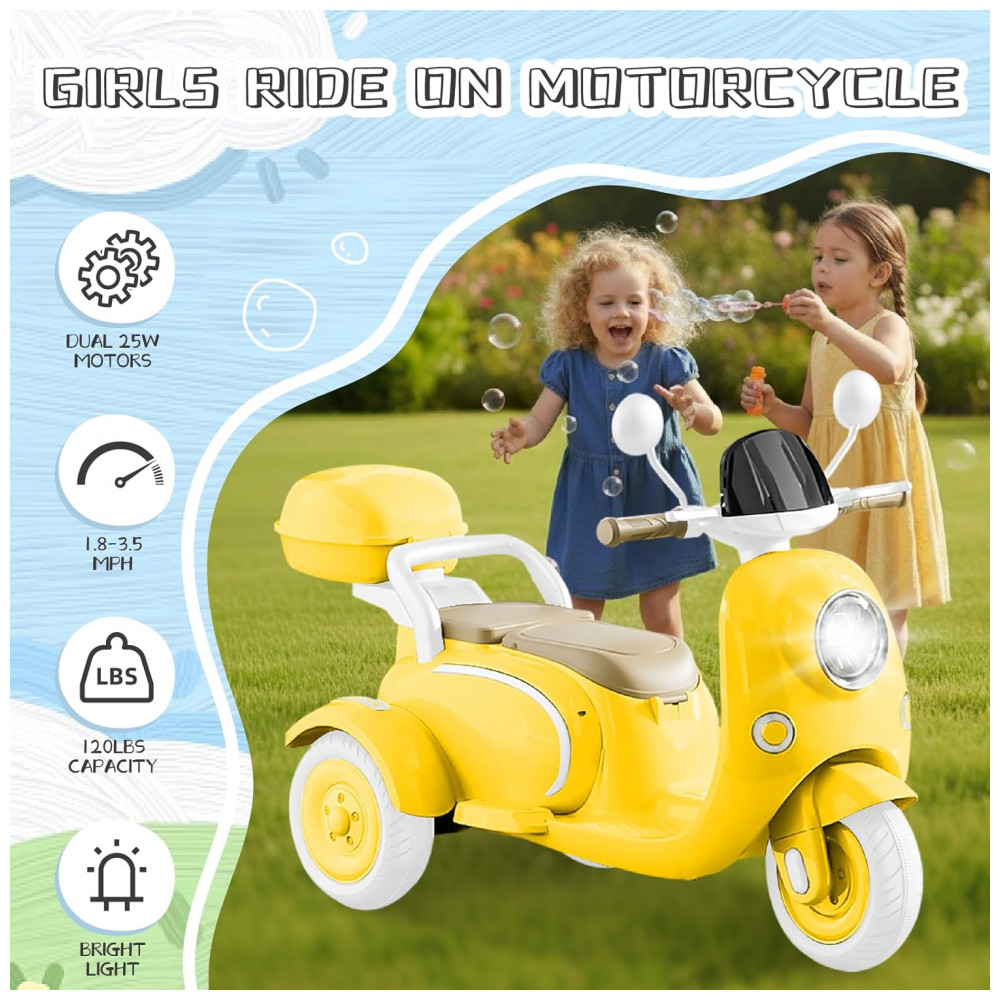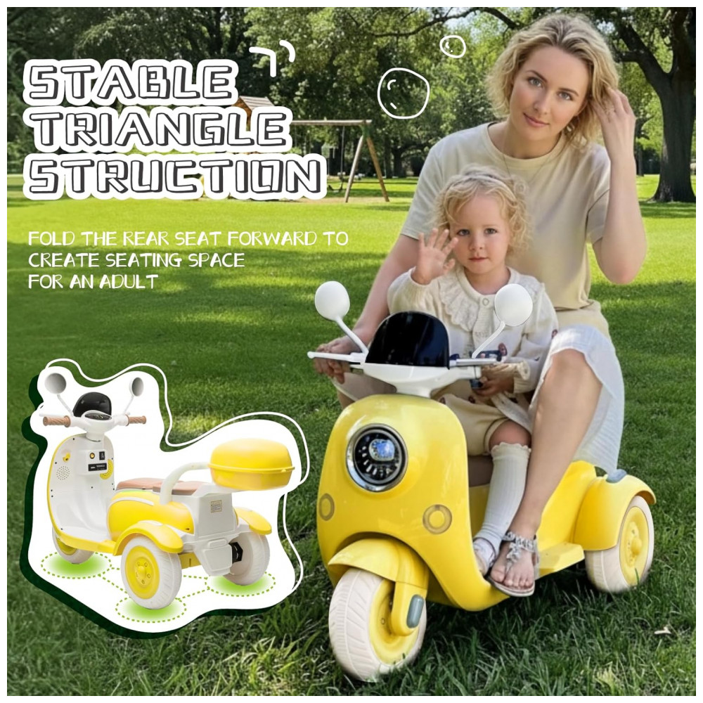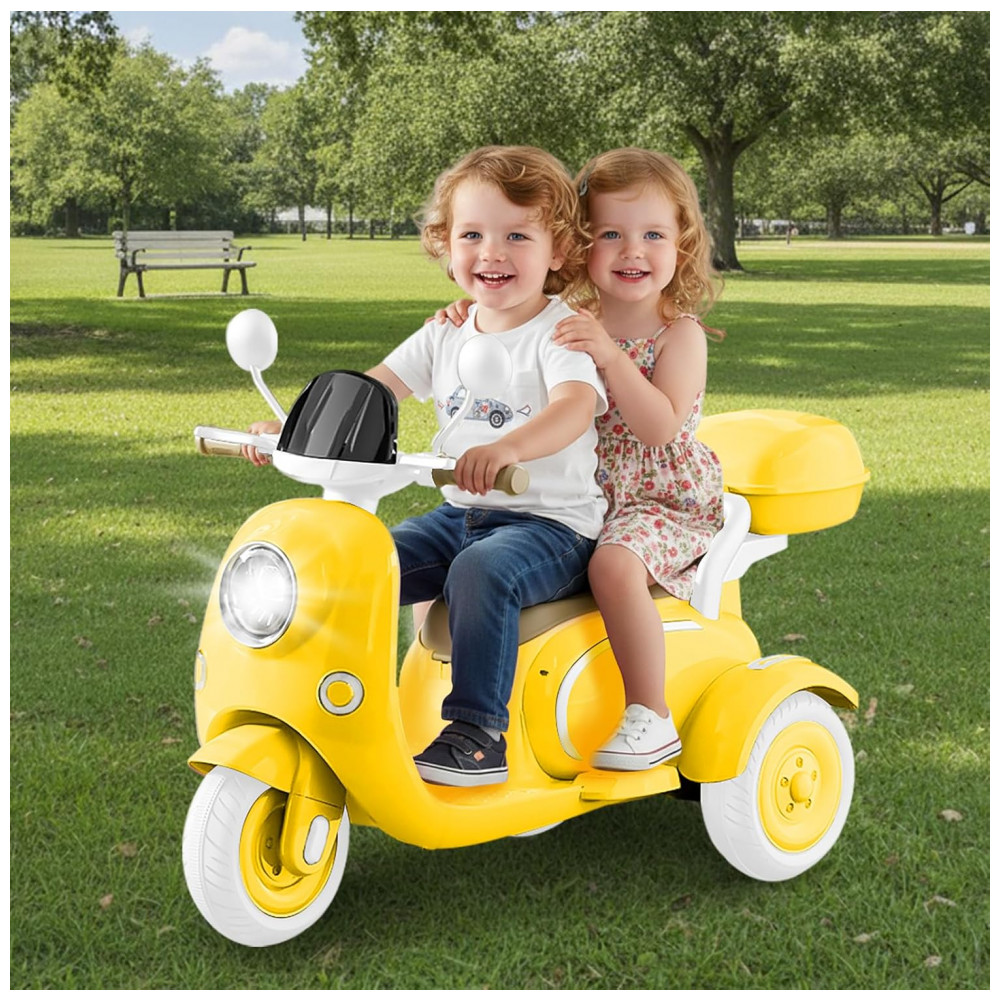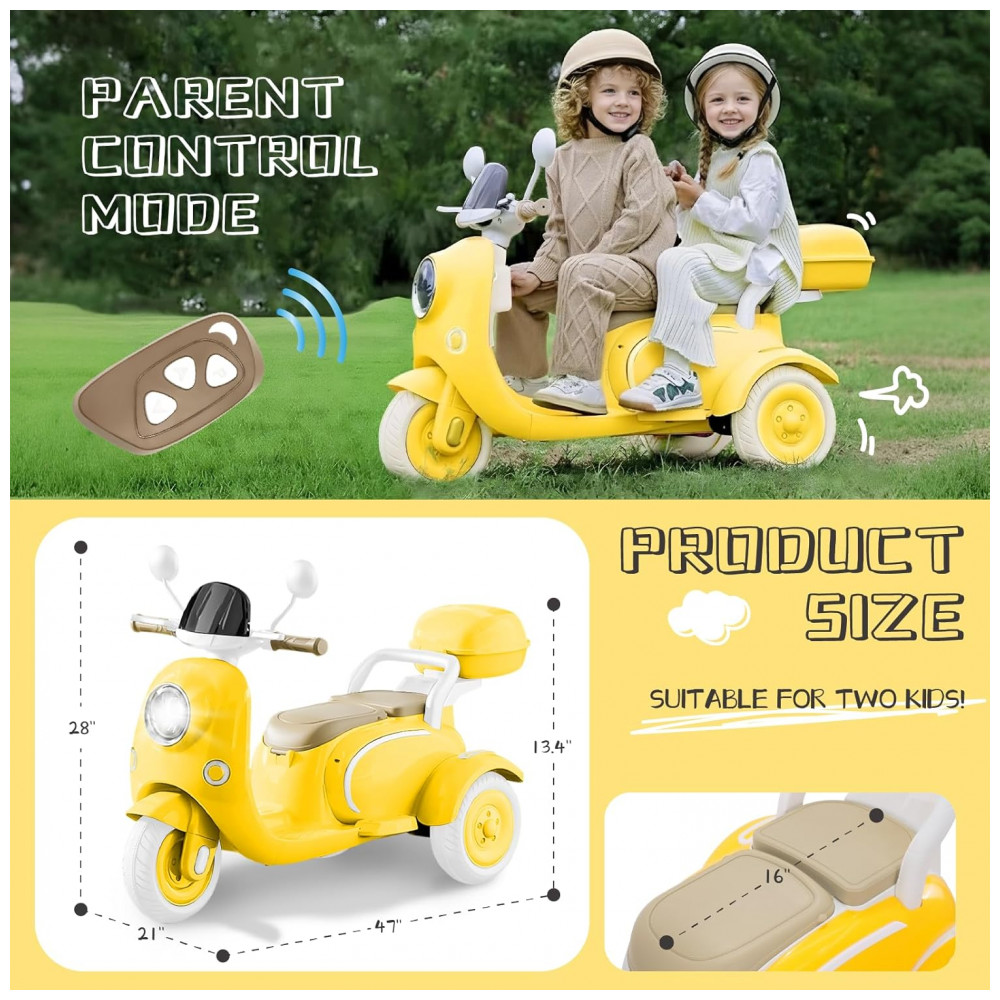 Moto Elétrica Infantil HEIMILI 12V Amarela 3 Rodas 2 Lugares com Bluetooth MP3 Baú e Estabilidade