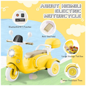 Moto Elétrica Infantil HEIMILI 12V Amarela 3 Rodas 2 Lugares com Bluetooth MP3 Baú e Estabilidade