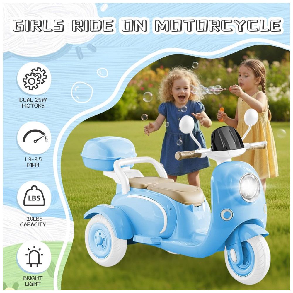 A moto elétrica HEIMILI é ideal para crianças a partir de 3 anos, com design adorável, estrutura reforçada (metal e plástico), três rodas para máxima estabilidade e assento traseiro basculante para transporte de irmãos ou brinquedos. Conta com bateria 12V, painel musical com Bluetooth e MP3, porta-objetos, e pneus antiderrapantes para segurança em pisos internos e externos.