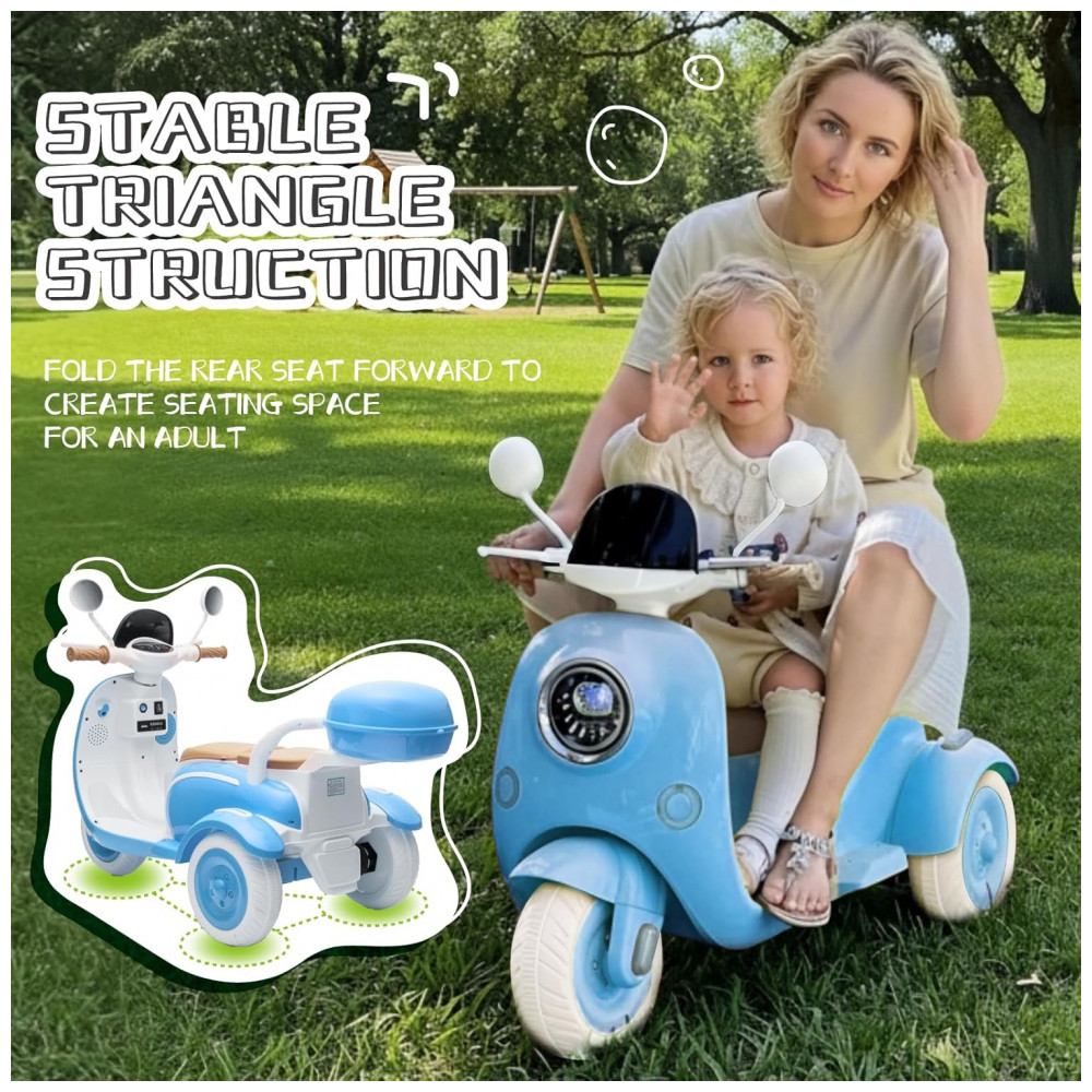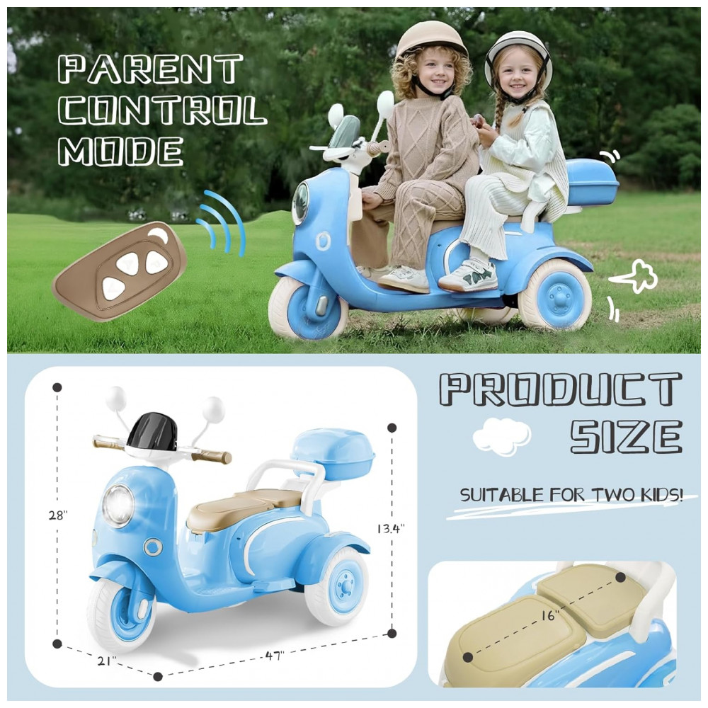 Moto Elétrica Infantil HEIMILI 12V Azul 3 Rodas 2 Lugares com Bluetooth MP3 Baú e Estabilidade