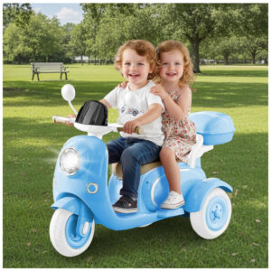 Moto Elétrica Infantil HEIMILI 12V Azul 3 Rodas 2 Lugares com Bluetooth MP3 Baú e Estabilidade