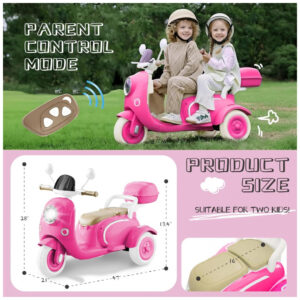 Moto Elétrica Infantil HEIMILI 12V Rosa 3 Rodas 2 Lugares com Bluetooth MP3 Baú e Estabilidade
