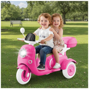 A moto elétrica HEIMILI é ideal para crianças a partir de 3 anos, com design adorável, estrutura reforçada (metal e plástico), três rodas para máxima estabilidade e assento traseiro basculante para transporte de irmãos ou brinquedos. Conta com bateria 12V, painel musical com Bluetooth e MP3, porta-objetos, e pneus antiderrapantes para segurança em pisos internos e externos.