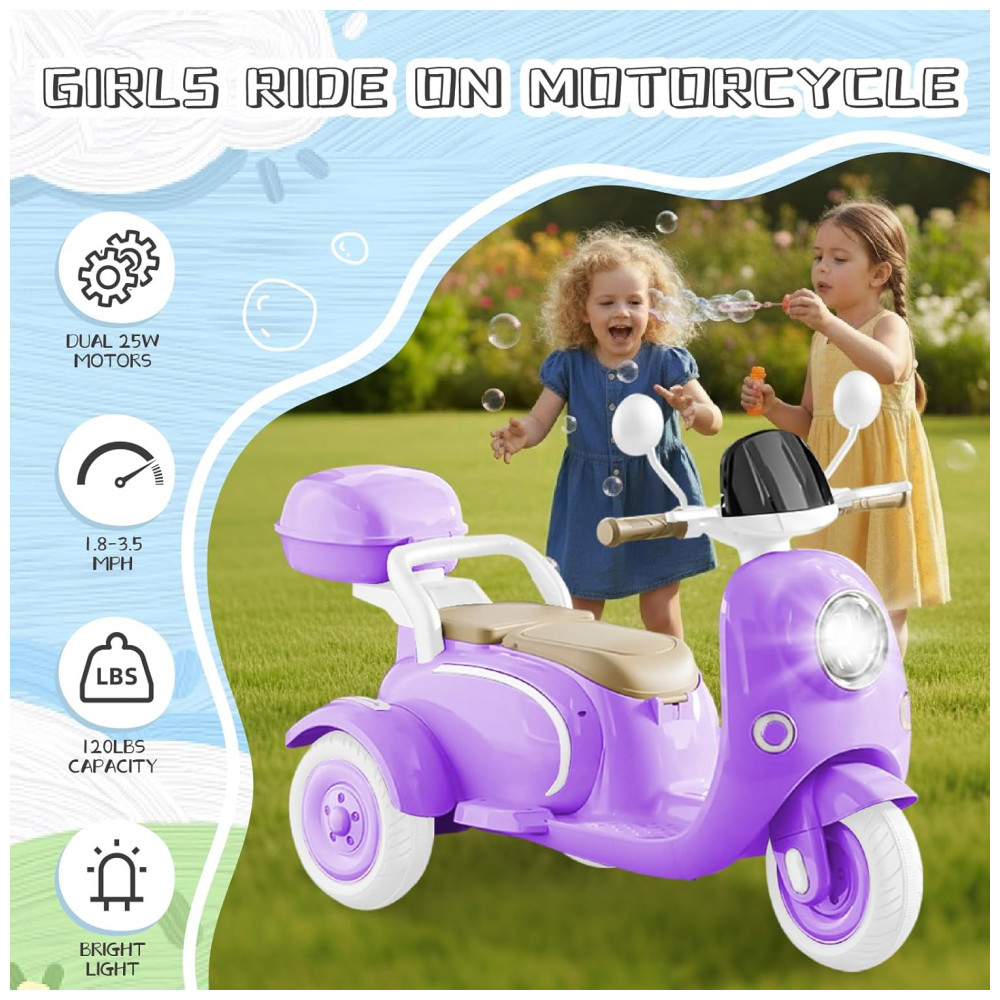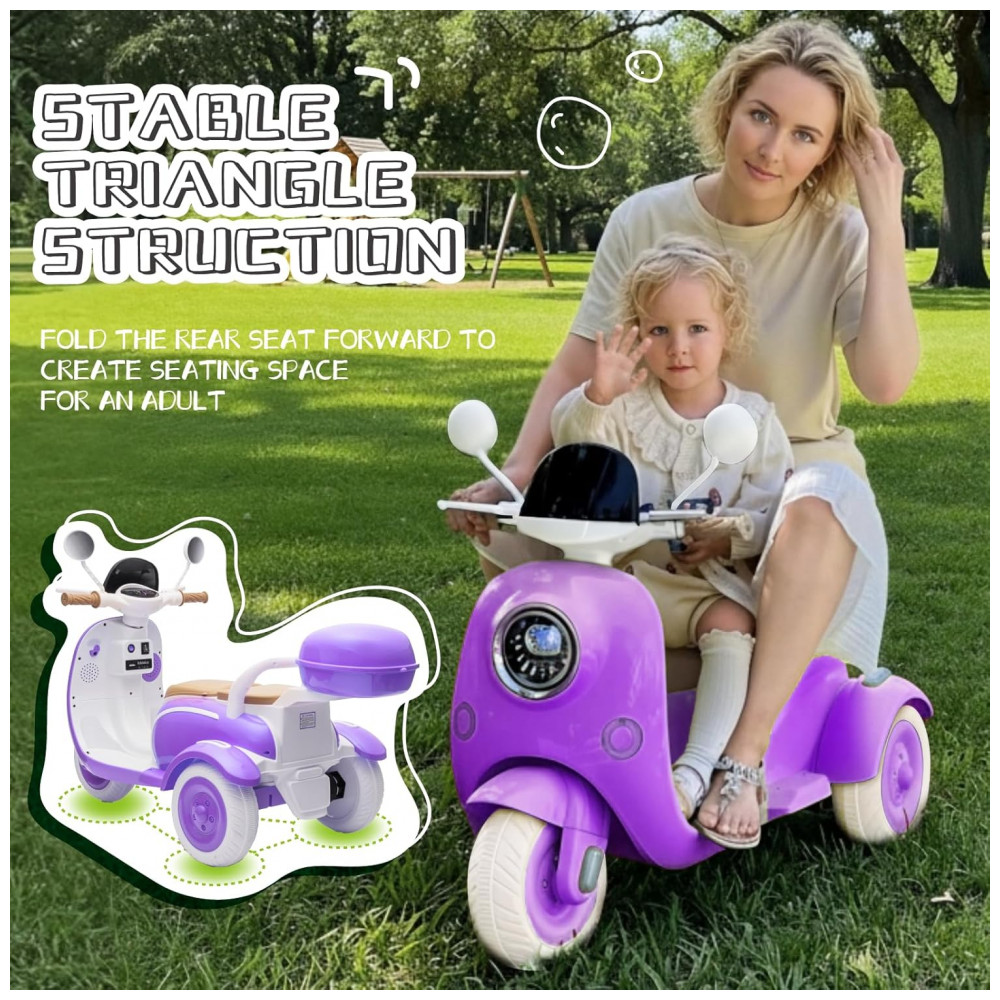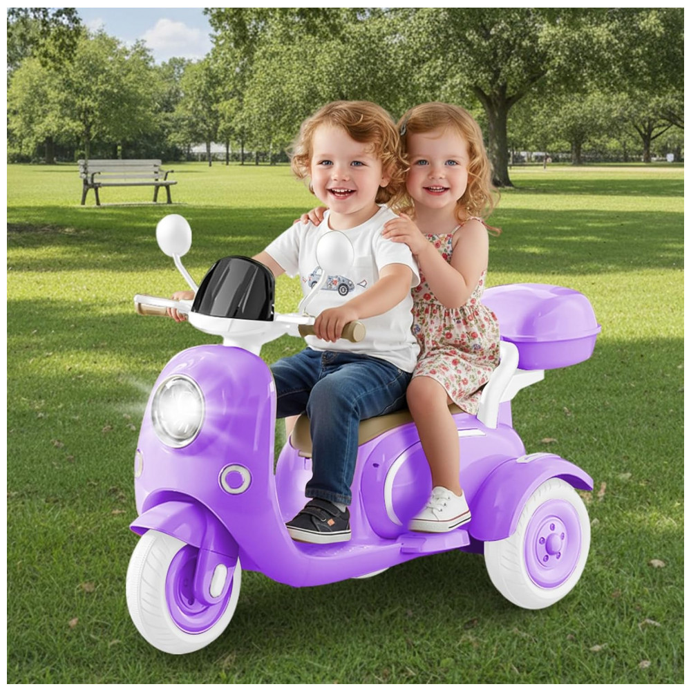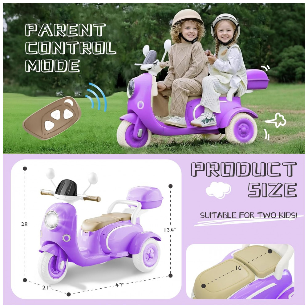 Moto Elétrica Infantil HEIMILI 12V Roxo 3 Rodas 2 Lugares com Bluetooth MP3 Baú e Estabilidade