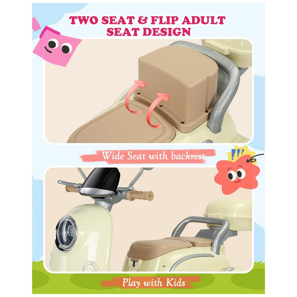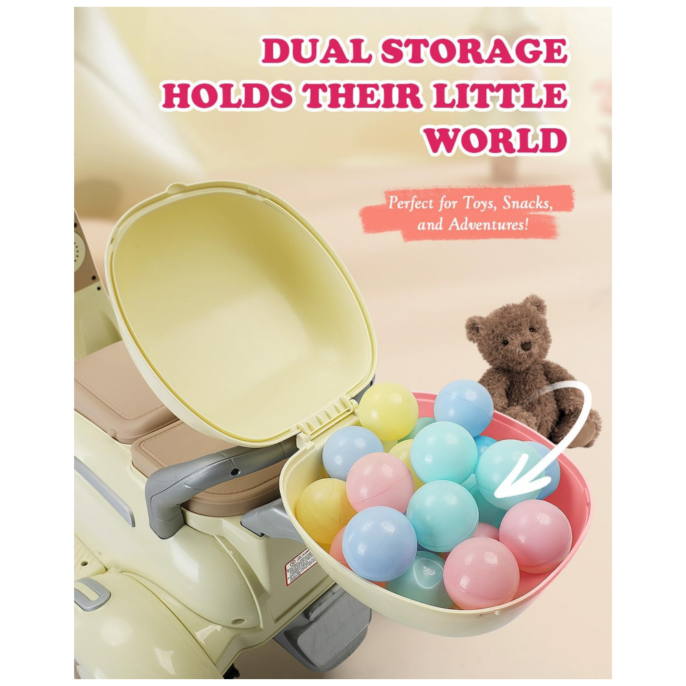Moto Elétrica Infantil Letsgoride 12V Amarelo Pastel 2 Lugares 3 Rodas Baú Musical Bluetooth LED Buzina 2x50W