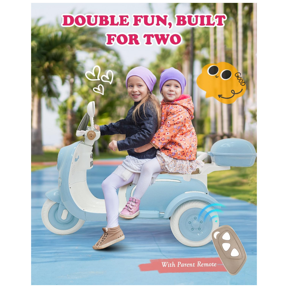Moto Elétrica Infantil Letsgoride 12V Azul 2 Lugares 3 Rodas com Controle Remoto Baú Bluetooth LED e Buzina 2x50W
