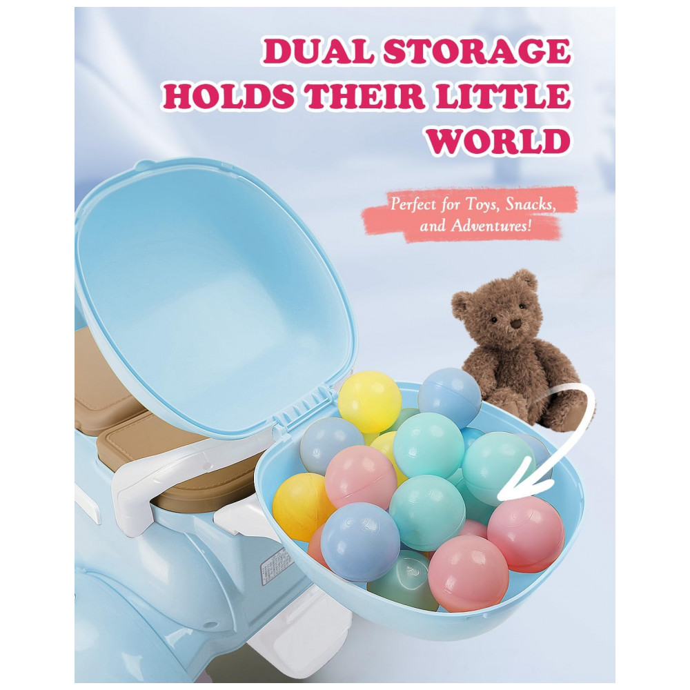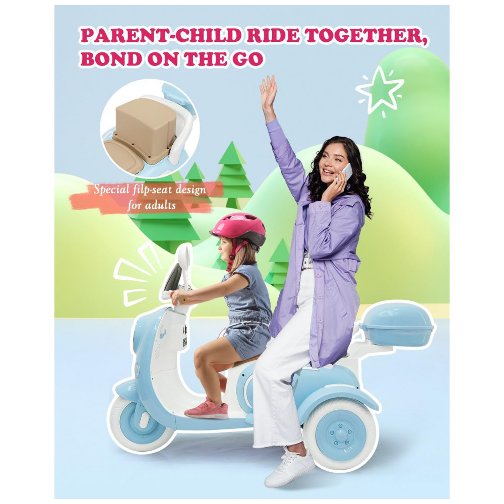 A moto elétrica infantil Letsgoride 12V rosa é perfeita para aventuras internas e externas de meninos e meninas de 3 a 8 anos, com dois motores de 50W e bateria que garante até 1 hora de uso. Design scooter de 3 rodas reforçada proporciona máxima estabilidade e evita tombos, enquanto o assento traseiro basculante comporta até 60 kg, ideal para transportar irmãos ou brinquedos. Painel multimídia com Bluetooth, músicas integradas, buzina e farol LED, além de compartimentos para snacks ou objetos sob o assento e no baú traseiro. Acompanha controle remoto parental para alta/baixa velocidade, marcha frente/ré e travas de segurança, oferecendo transição do uso assistido ao independente.