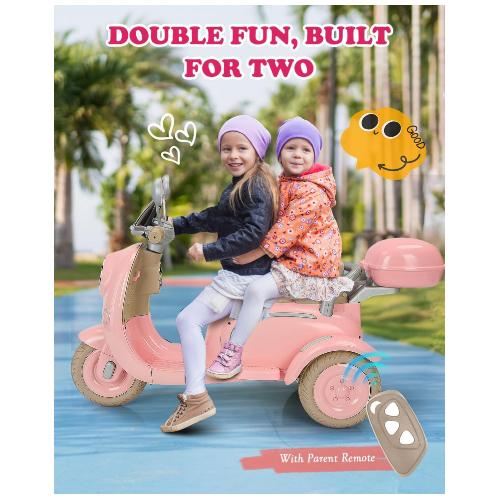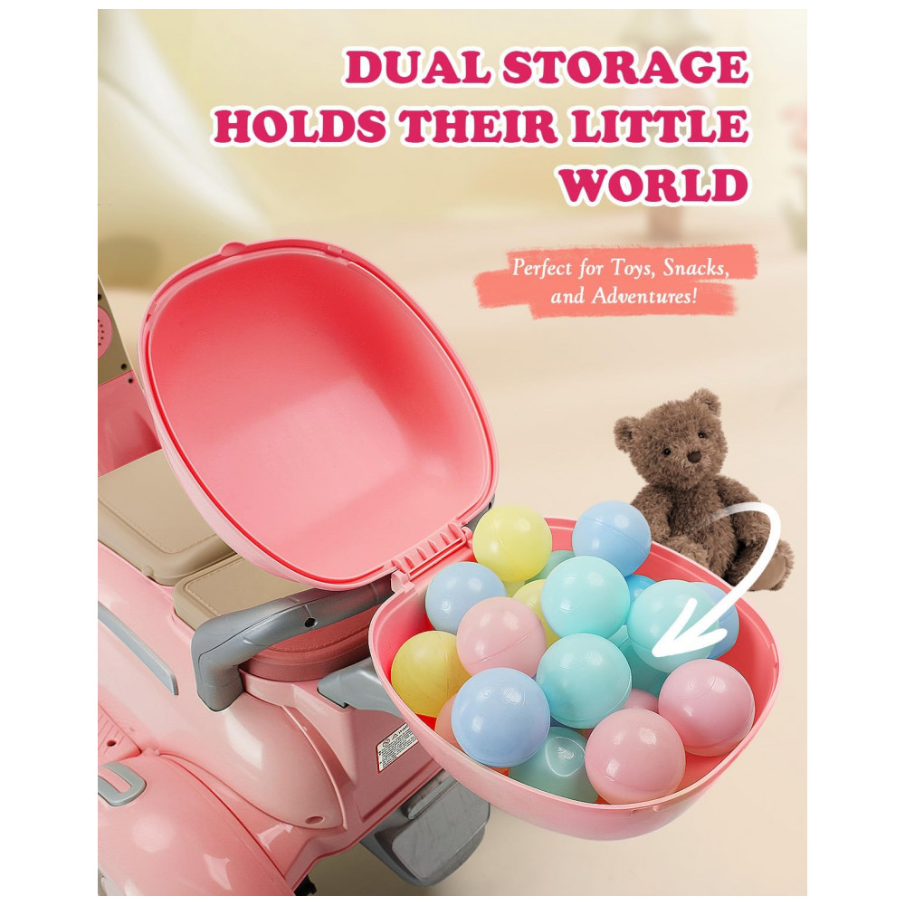 A moto elétrica infantil Letsgoride 12V rosa é perfeita para aventuras internas e externas de meninos e meninas de 3 a 8 anos, com dois motores de 50W e bateria que garante até 1 hora de uso. Design scooter de 3 rodas reforçada proporciona máxima estabilidade e evita tombos, enquanto o assento traseiro basculante comporta até 60 kg, ideal para transportar irmãos ou brinquedos. Painel multimídia com Bluetooth, músicas integradas, buzina e farol LED, além de compartimentos para snacks ou objetos sob o assento e no baú traseiro. Acompanha controle remoto parental para alta/baixa velocidade, marcha frente/ré e travas de segurança, oferecendo transição do uso assistido ao independente.