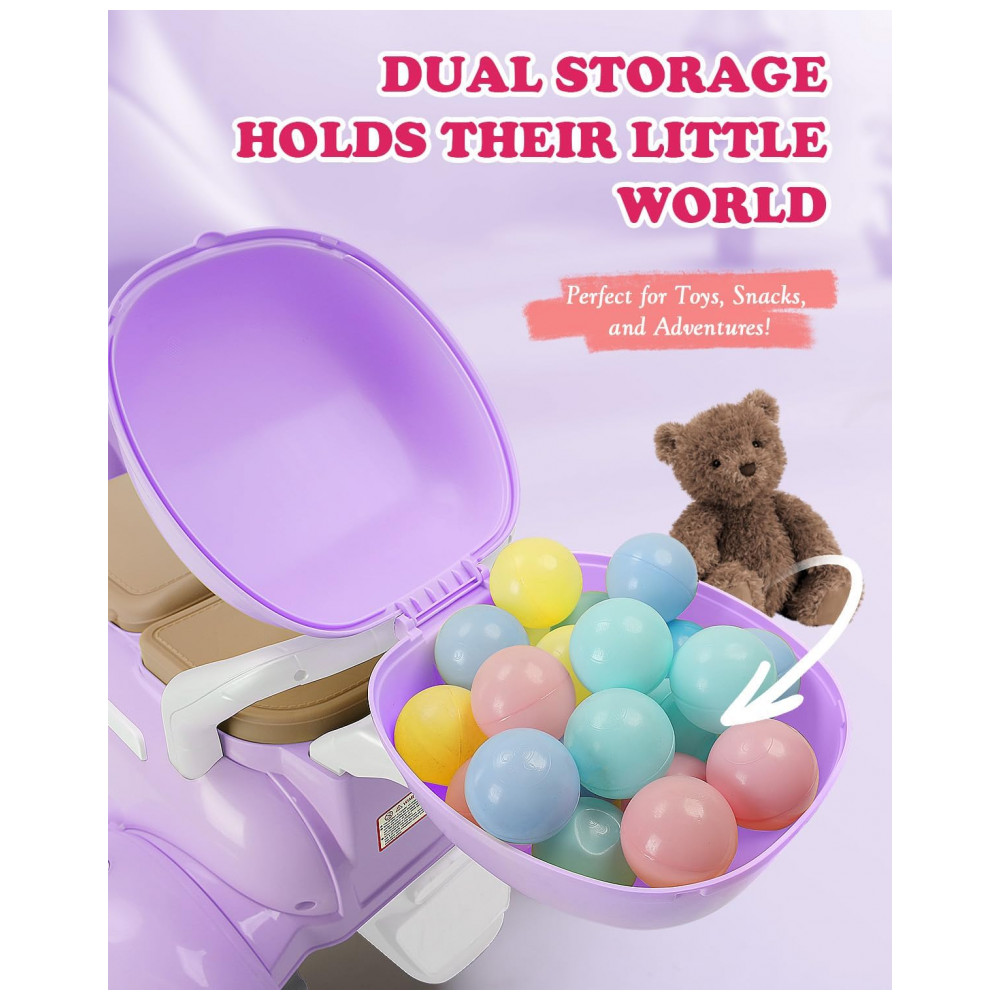 Moto Elétrica Infantil Letsgoride 12V Roxa 2 Lugares 3 Rodas Baú Musical Bluetooth LED Buzina 2x50W