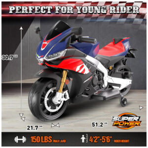 Moto Elétrica Infantil Letsgoride Aprilia RSV4 24V Azul e Vermelha com Rodinhas de Treinamento Farol Música e USB 200W