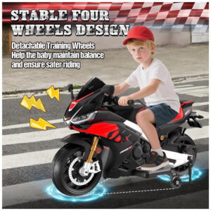 A moto elétrica infantil Letsgoride Aprilia RSV4, licenciada oficialmente, oferece visual esportivo e realista para crianças a partir de 3 anos, com estrutura reforçada em polipropileno, rodinhas de treinamento para estabilidade e operação simples via pedal e botão. Conta com motor de 200W, bateria 24V 7Ah, velocidade ajustável até 16km/h (inclui marcha à ré), autonomia de até 2 horas e capacidade máxima para 68 kg. Recursos incluem música integrada, conexão USB, MP3, TF card, efeitos sonoros realistas (buzina, motor), painel luminoso e farol dianteiro. Certificada FM963, acompanha manual e é indicada para ambientes externos.