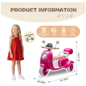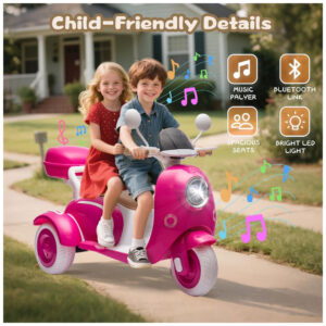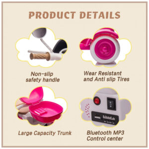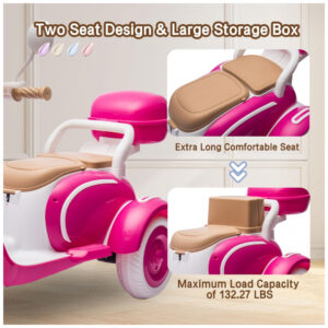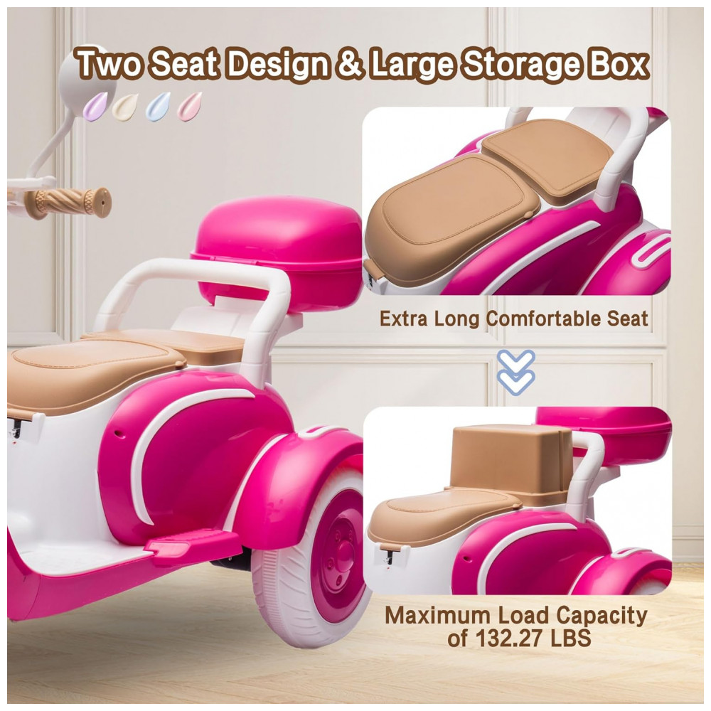Moto Elétrica Infantil NEWDOOD 12V Rosa 2 Lugares 3 Rodas Bluetooth USB Baú Lento Start Estabilidade