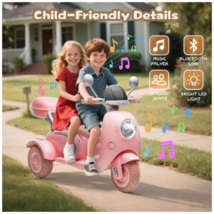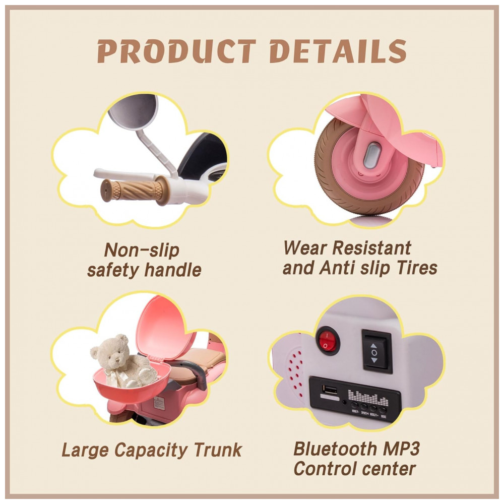 Moto Elétrica Infantil NEWDOOD 12V Rosa Claro 2 Lugares 3 Rodas Bluetooth USB Baú Lento Start Estabilidade