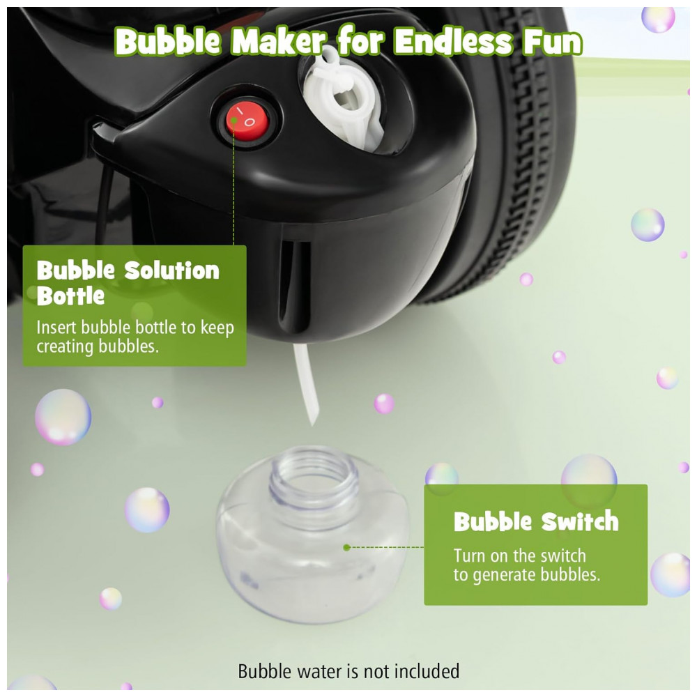 O painel de operação deste motor elétrico vem com botão de música para diversão extra durante o jogo. Além disso, o carro bolha é equipado com faróis iluminados por LED para brincadeiras seguras durante a noite e equipado com buzina para alertar os pedestres.