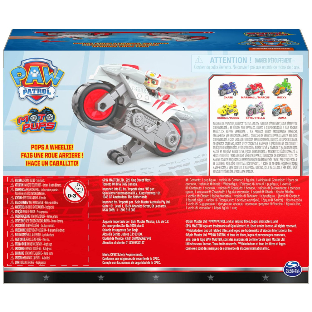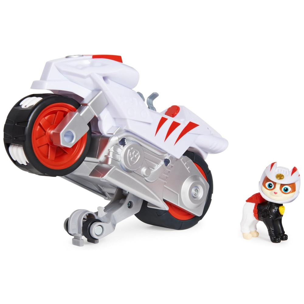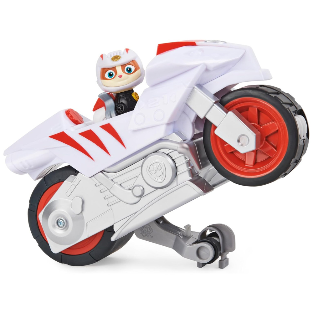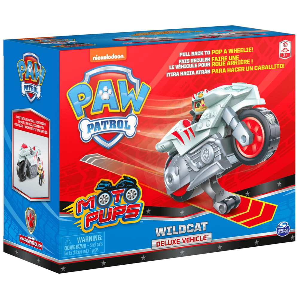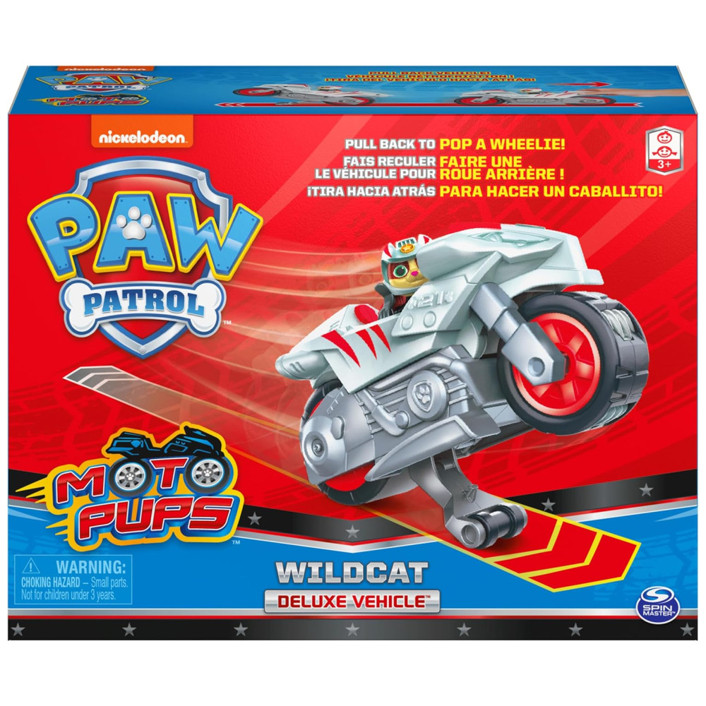 Acelere para o resgate com o primeiro membro felino da Patrulha Canina, Wildcat, e seu veículo Moto Pups Deluxe A motocicleta exclusiva da Wildcats apresenta gráficos e detalhes autênticos, rodas grandes e uma função pullback que permite realizar cavalinhos Equipado com sua jaqueta e capacete de motociclista, a figura do Wildcat incluída está pronta para se juntar aos filhotes para uma emocionante ação dos Moto Pups.