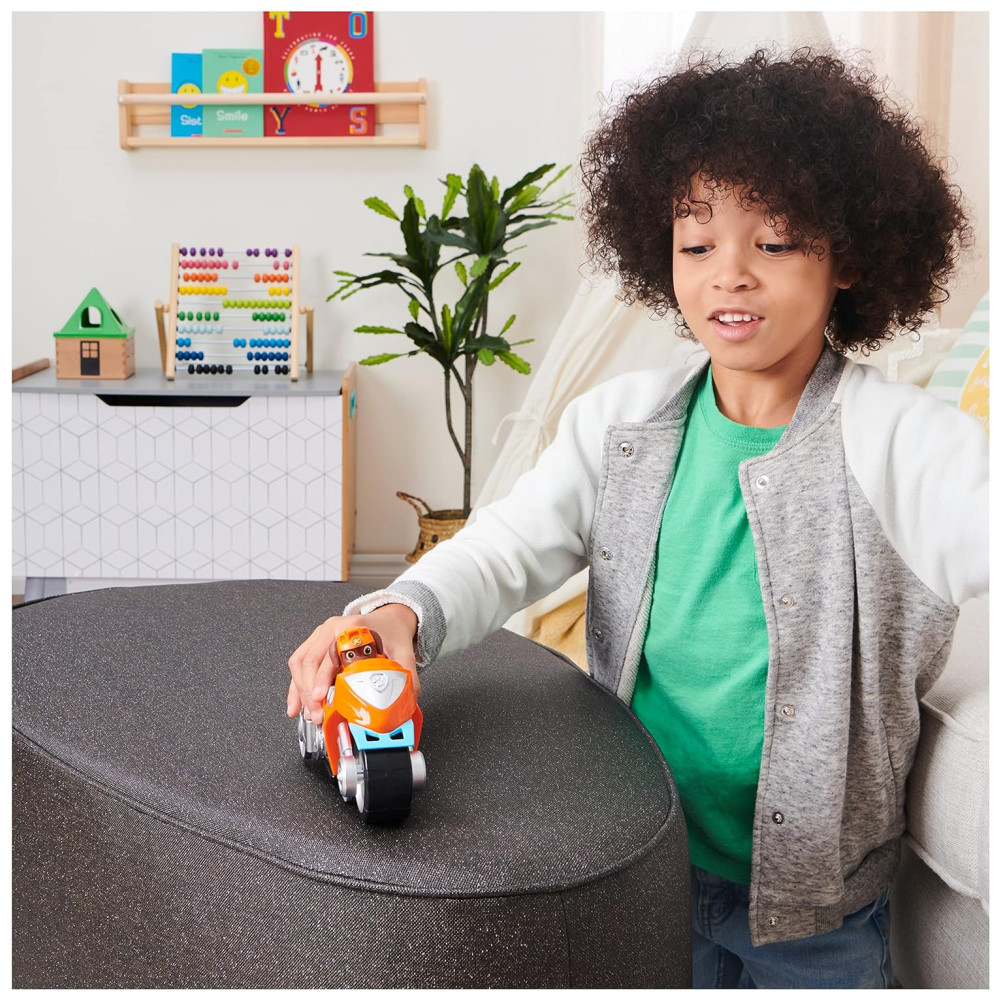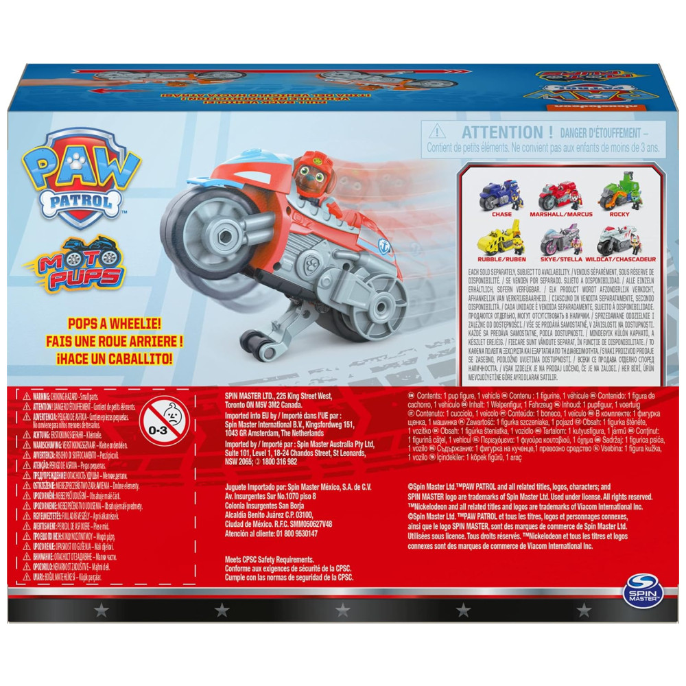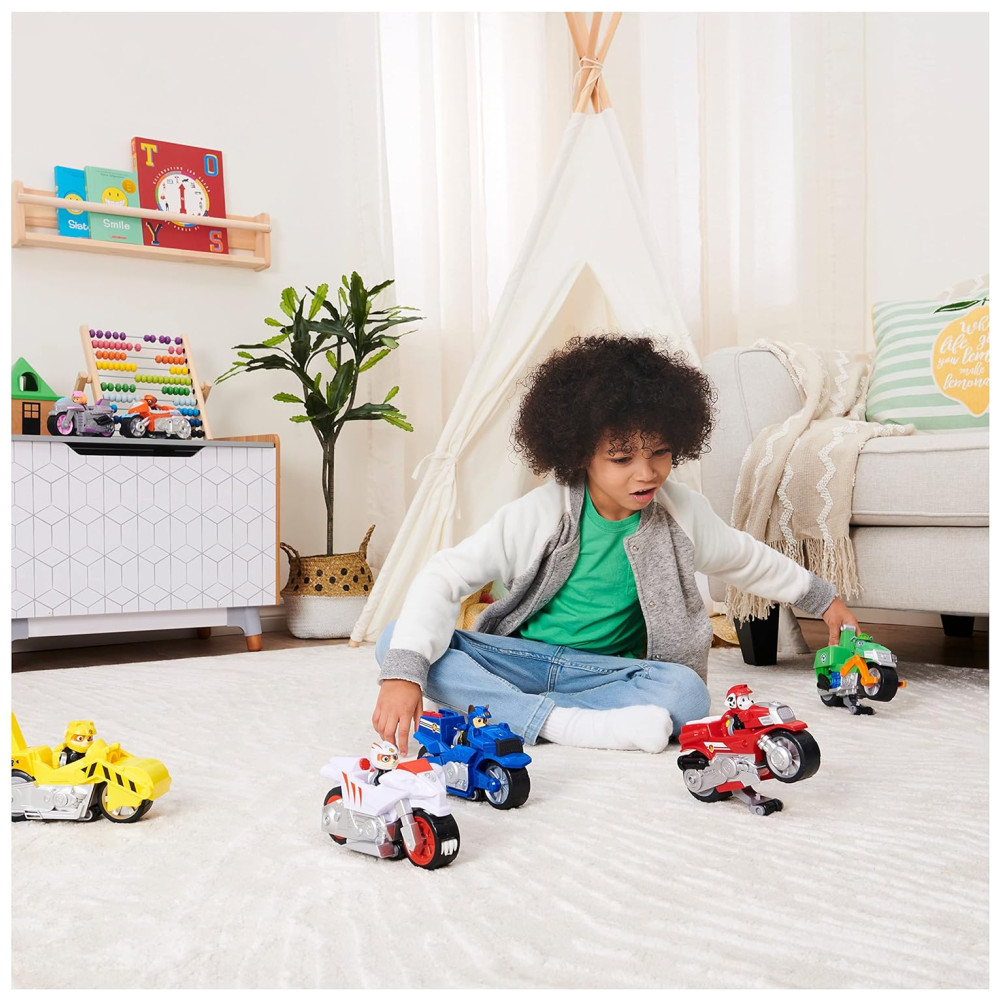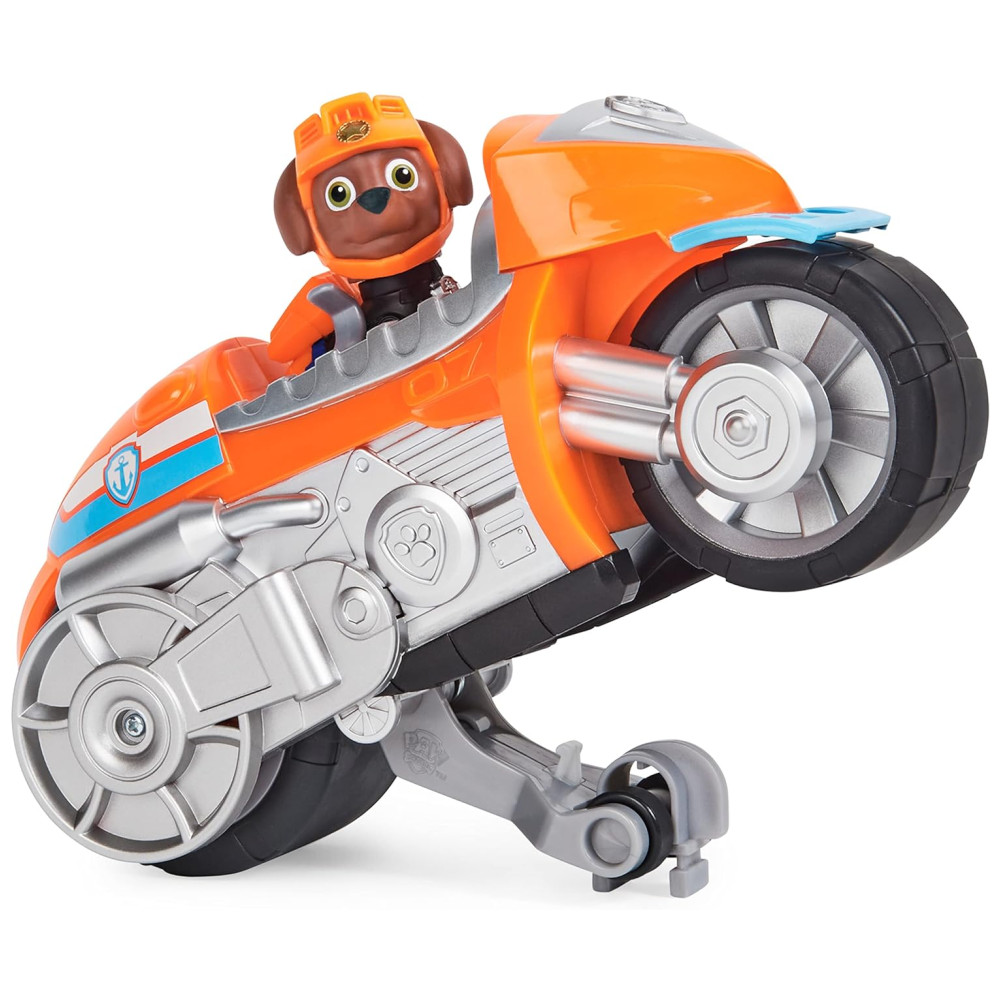 Acelere para o resgate com a motocicleta Moto Pups Deluxe do personagem Zuma da série de sucesso PAW Patrol A motocicleta possui gráficos e detalhes autênticos, rodas grandes e uma função pullback que permite realizar cavalinhos. Zuma está equipado com sua jaqueta e capacete de motociclista e está pronto para ação emocionante dos Moto Pups. Prenda Zuma no banco do motorista, puxe o veículo para trás e observe o partir em alta velocidade.