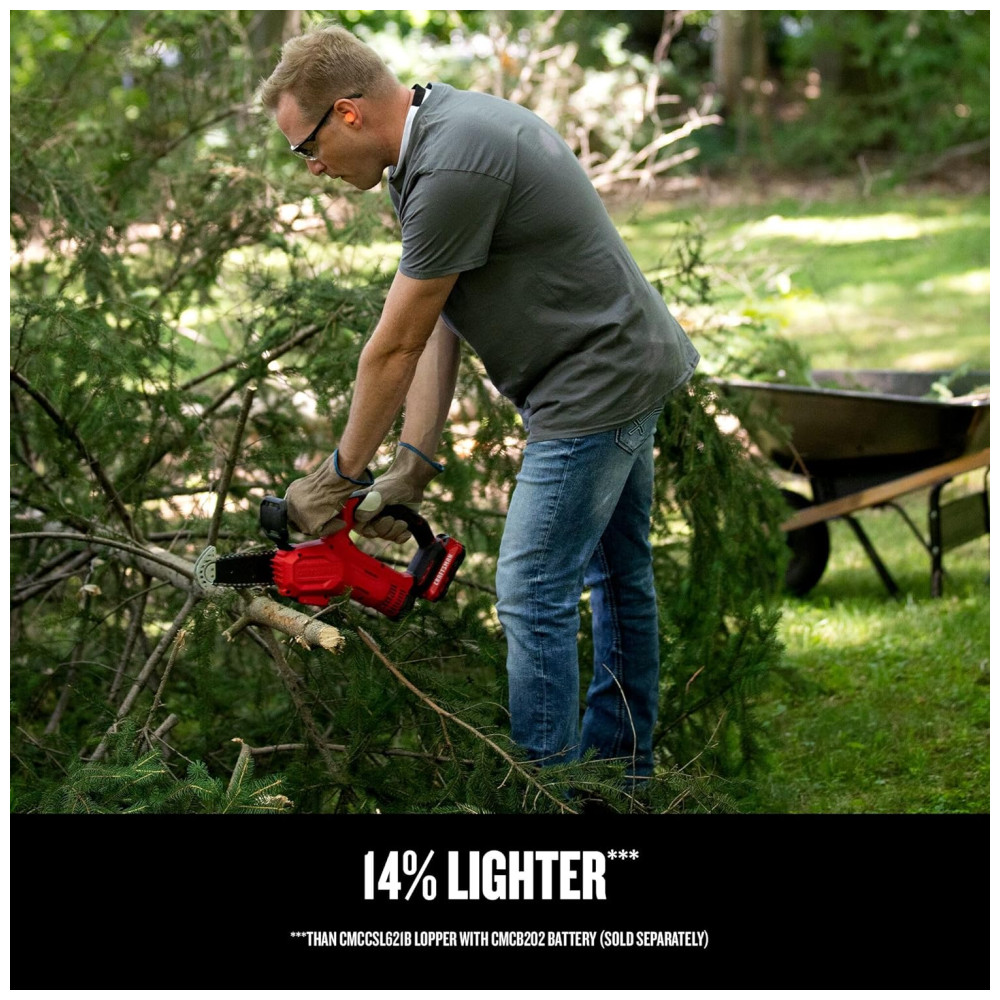 A motosserra de poda V20 é uma excelente opção para quem busca praticidade e eficiência. Equipada com uma bateria de 2,0 Ah, ela tem potência de corte ideal para realizar até 85 cortes por carga. Com barra e corrente de 6 pol, a capacidade de corte é de até 4 pol, o que garante um trabalho rápido e eficiente. Além disso, ela é 50 mais compacta e 14 mais leve do que o modelo CMCCSL621B, o que proporciona facilidade de uso e manobrabilidade. A proteção de ponta integrada é um ótimo recurso e foi projetada para ajudar a fornecer controle sobre cortes superiores. A plataforma da bateria V20 é compatível com equipamentos para atividades ao ar livre e ferramentas elétricas CRAFTSMAN V20, permitindo que você encontre a linha completa de ferramentas e equipamentos essenciais para atividades ao ar livre para um trabalho que o deixará orgulhoso. A motosserra também conta com tensionamento da corrente com trava de parafuso, fixação confiável e bainha de armazenamento com suporte de chave integrado para fácil remoção da bainha. Para maior comodidade, ela é compatível com o sistema de organização de parede VERSATRACK, permitindo que você pendure esta ferramenta diretamente no sistema de organização de parede VERSATRACK vendido separadamente . Com a motosserra V20, você terá uma ferramenta prática, eficiente e confiável para suas atividades ao ar livre.