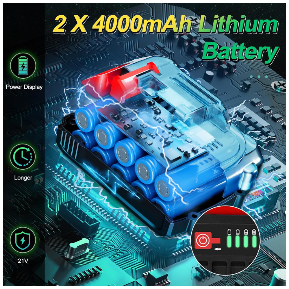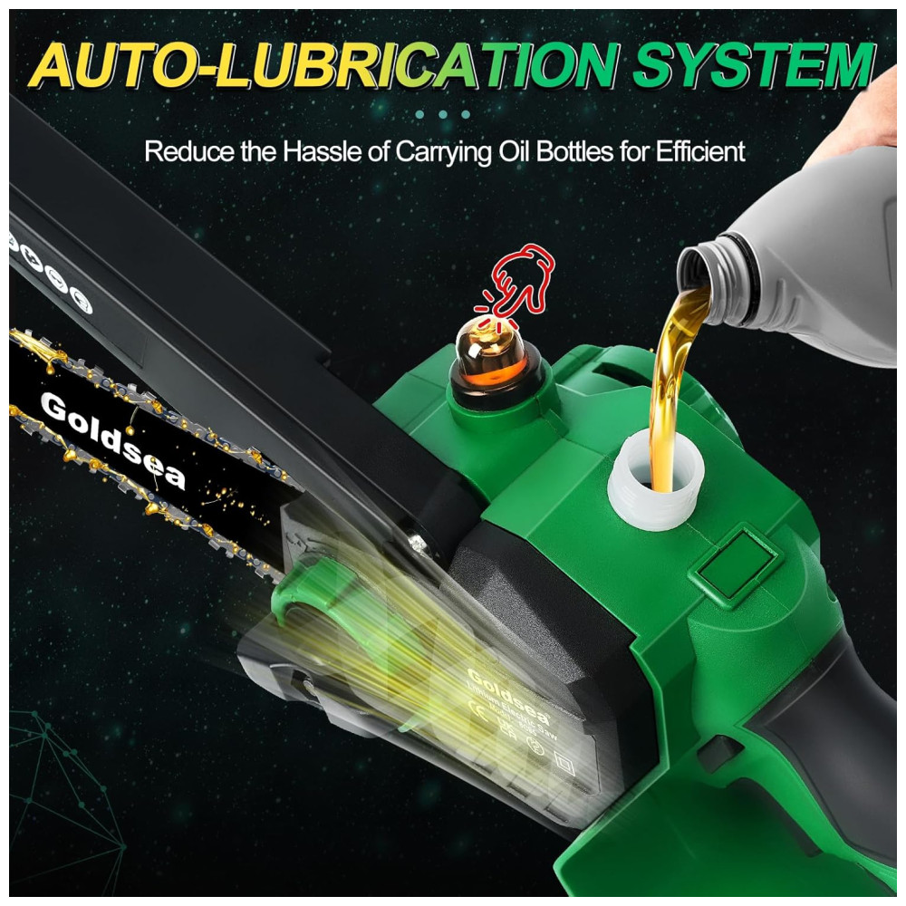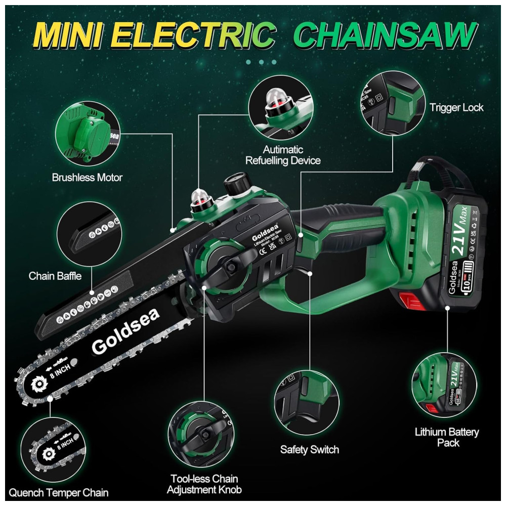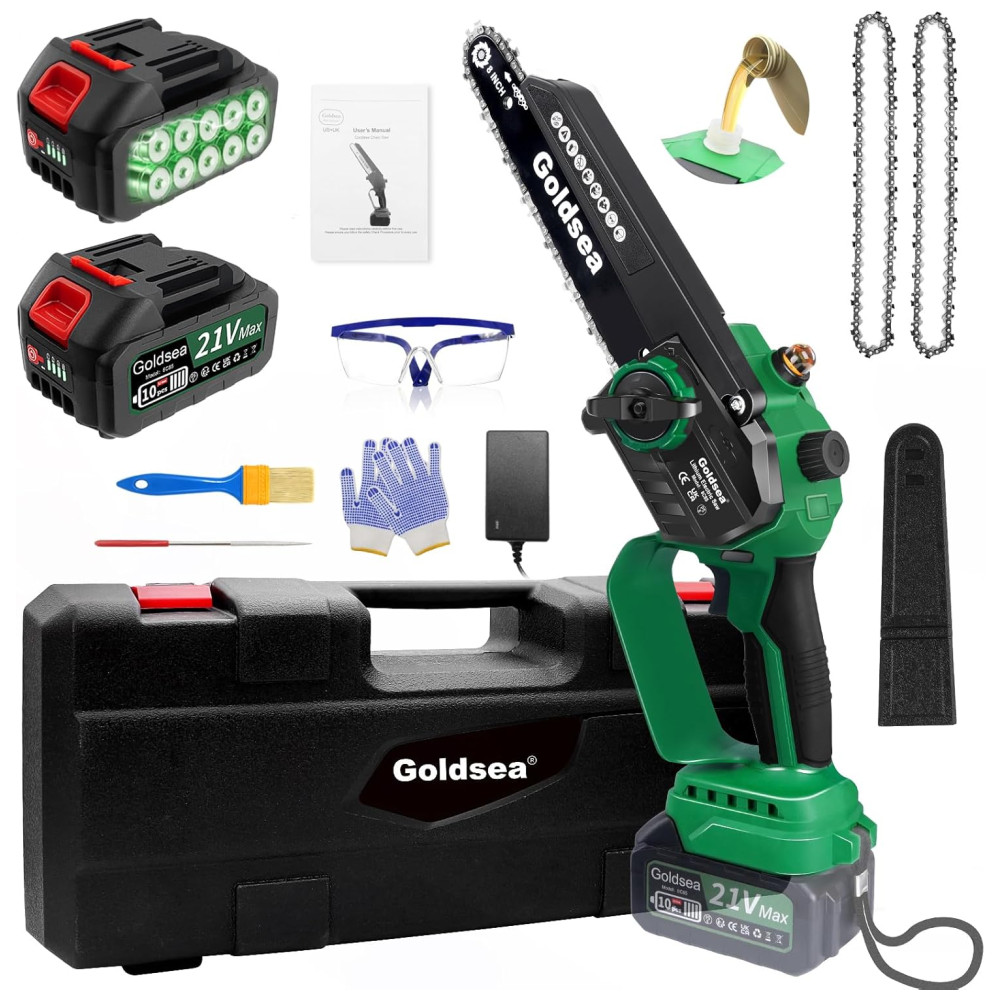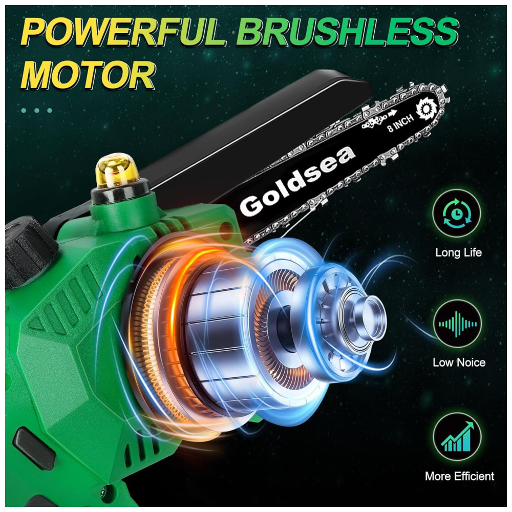 A Mini Motosserra Goldsea é uma ferramenta de corte eficiente, capaz de cortar toras de até 8 polegadas de diâmetro em cerca de 10 segundos, dependendo do tamanho e da dureza da madeira. Com um sistema dinâmico poderoso, possui um motor sem escovas atualizado que fornece à motosserra tempos de execução mais longos, mais torque e mais potência, além de reduzir o desgaste e prolongar a vida útil da ferramenta. A corrente de aço manganês de alta qualidade é profundamente endurecida para garantir um corte suave. A Mini Motosserra elétrica é recarregável e vem equipada com 2 baterias de íons de lítio removíveis e recarregáveis de 21 V de 4000 mAh para longa vida útil. É fácil de usar e versátil, perfeita para corte de madeira, poda de jardinagem, poda de árvores e corte de arbustos, podendo ser amplamente utilizada em jardins, fazendas, parques, florestas, pomares e estufas. A Mini Motosserra é portátil e pesa cerca de 1,36 quilos, incluindo baterias, o que a torna leve e fácil de controlar, adequada para trabalhos internos e externos. Possui 5 características de segurança, incluindo trava de segurança, batente de segurança, luvas, cabo texturizado antiderrapante e óculos de proteção.