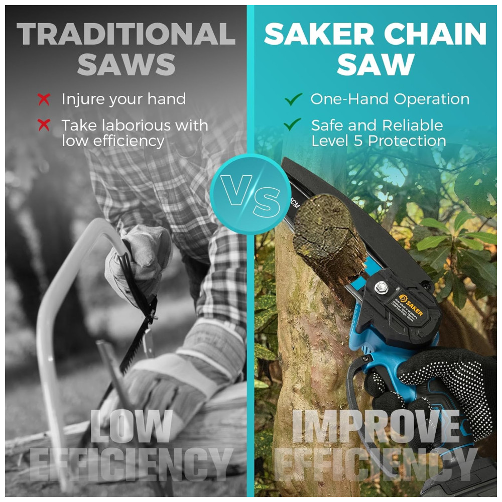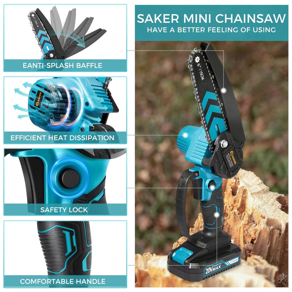 A Mini Motosserra Saker sem fio de 6 polegadas é a ferramenta perfeita para mães, amigas, faz tudo e mulheres que gostam de trabalhar com madeira ou organizar o quintal. Com um comprimento de face cortável de 6 polegadas e um comprimento total de chapa de aço de 9 polegadas, você pode cortar árvores mais grossas para atender melhor às suas necessidades. A mini motosserra Saker adapta uma corrente guia de alta qualidade que passou por um processo de têmpera profunda para garantir um corte suave. Além disso, a mini motosserra sem fio Saker usa um motor de cobre puro, que é muito potente, aumentando a eficiência de corte e tornando o mais rápido. A motosserra elétrica Saker sem fio é recarregável e equipada com uma bateria de lítio recarregável de 20 V 1500 mAh, que pode ser usada por um longo tempo. A mini motosserra Smart Saker é uma motosserra pequena, prática, rápida e fácil de montar, levando apenas 1 minuto para toda a instalação. A mini motosserra de 6 polegadas sem fio usa um motor de alta eficiência com fio de cobre atualizado, oferecendo à sua ferramenta maior tempo de execução, mais torque e mais potência, estendendo a vida útil da motosserra portátil Smartsaker. Com uma superfície de corte mais longa, você pode cortar árvores um pouco mais grossas com menos esforço, proporcionando uma melhor experiência. A mini motosserra Saker 6 será uma boa ajudante em seu trabalho de marcenaria Se você tiver alguma dúvida sobre as motosserras elétricas, entre em contato conosco a qualquer momento, estamos sempre disponíveis.