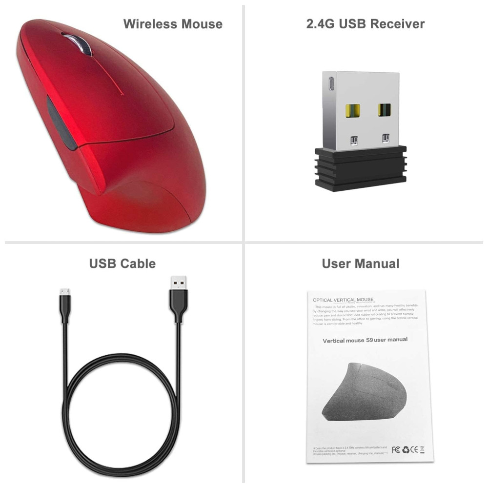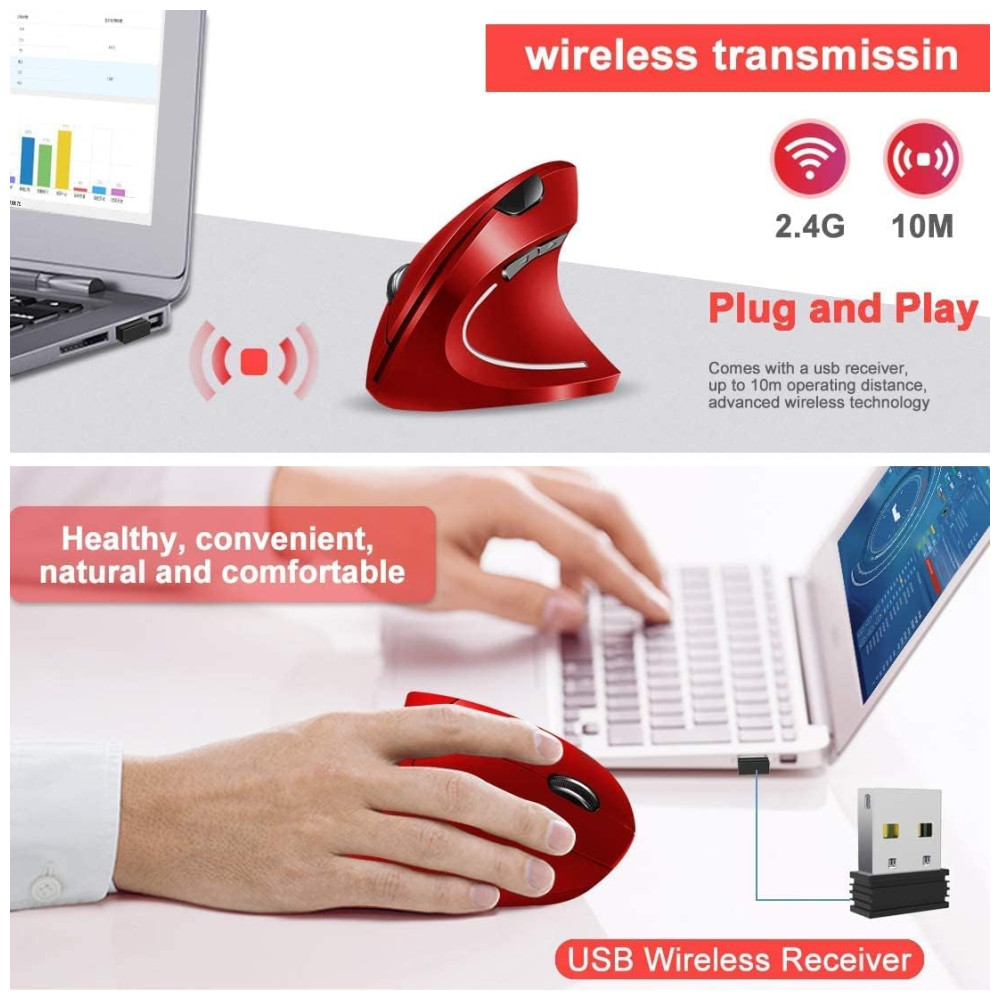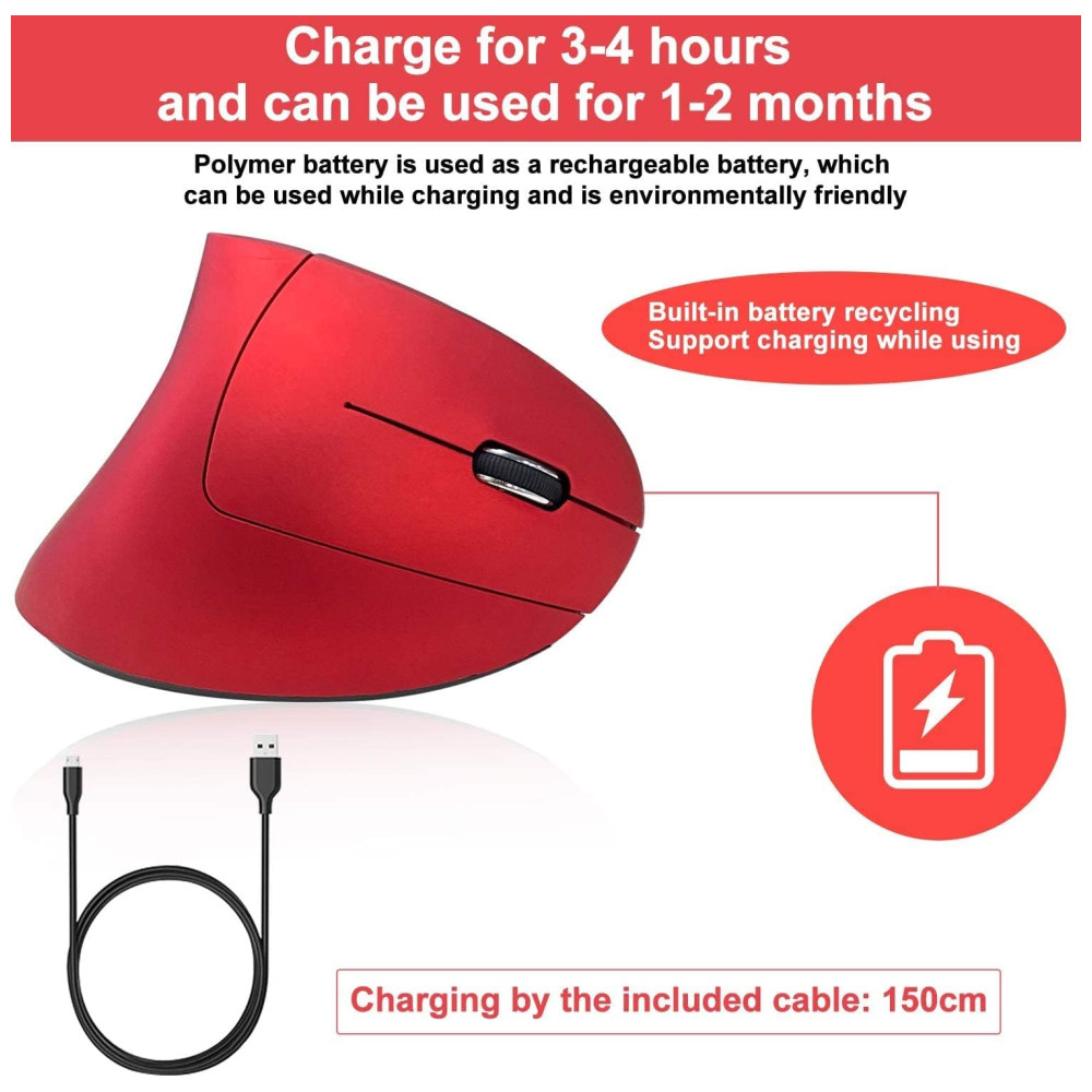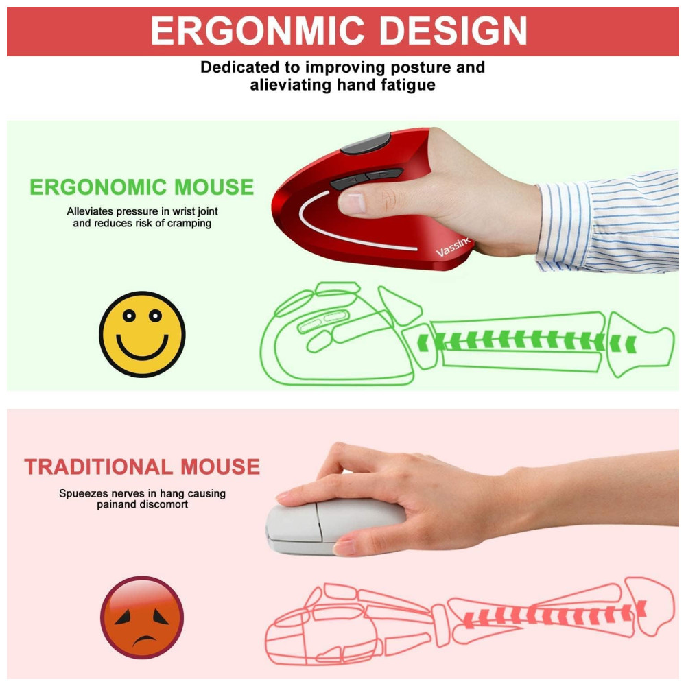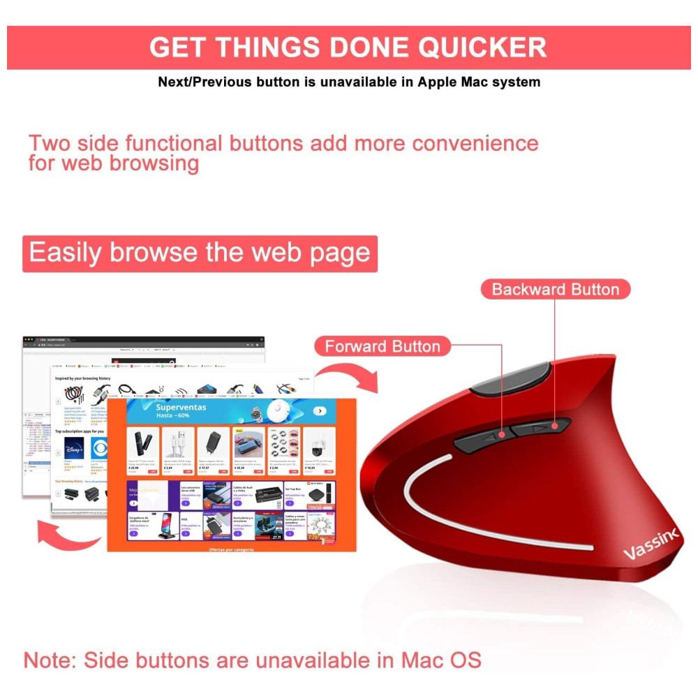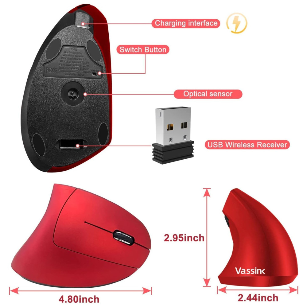 Mouse Ergonômico Vertical Óptico sem Fio Reduz a Tensão do Pulso Multifunções e Luz LED, 800, 1600 DPI, VASSINK, Vermelho