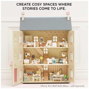 Este conjunto de móveis para casa de bonecas é da série Rosebud, que se destaca pelos detalhes realistas e cores suaves. As peças são feitas de madeira e algumas possuem acabamento em tecido. Além disso, as gavetas e armários são funcionais e há pequenos acessórios que dão vida ao ambiente. Na sala de estar, há um piano rosa e um relógio de pêndulo azul, além de um conjunto de jantar com cadeiras recortadas em forma de coração. O China Cupboard inclui pratos e sobremesas. Este conjunto de 24 peças é pintado à mão e projetado intuitivamente pela Le Toy Van. Ele incentiva a imaginação criativa e proporciona horas de diversão. É colorido, educacional e ambientalmente amigo, e inclui todos os acessórios ilustrados. É um ótimo complemento para qualquer casa de bonecas e inspira brincadeira interativa e desenvolvimento social. As bonecas são vendidas separadamente. Adequado para crianças a partir de 3 anos.