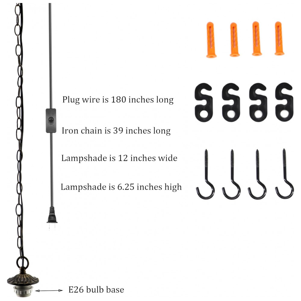 A base do lustre é em metal bronze, conferindo robustez e estilo. O produto é equipado com um interruptor de botão embutido no cabo para maior praticidade. A luminária suporta lâmpadas com base E26, recomendando-se o uso de LEDs quentes ou lâmpadas incandescentes brancas (modelos A19, A15, G45, G40), com potência máxima de até 100 watts para garantir uma iluminação eficiente e acolhedora. As lâmpadas não estão incluídas.