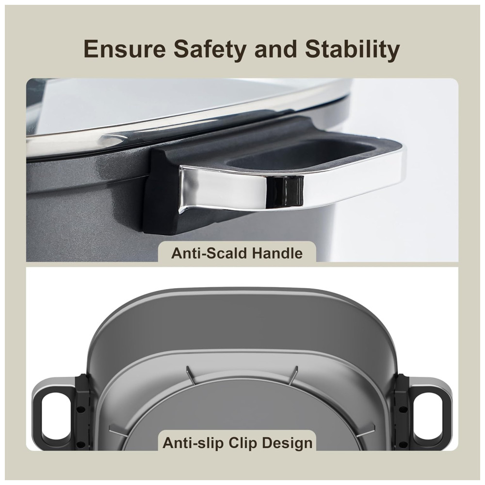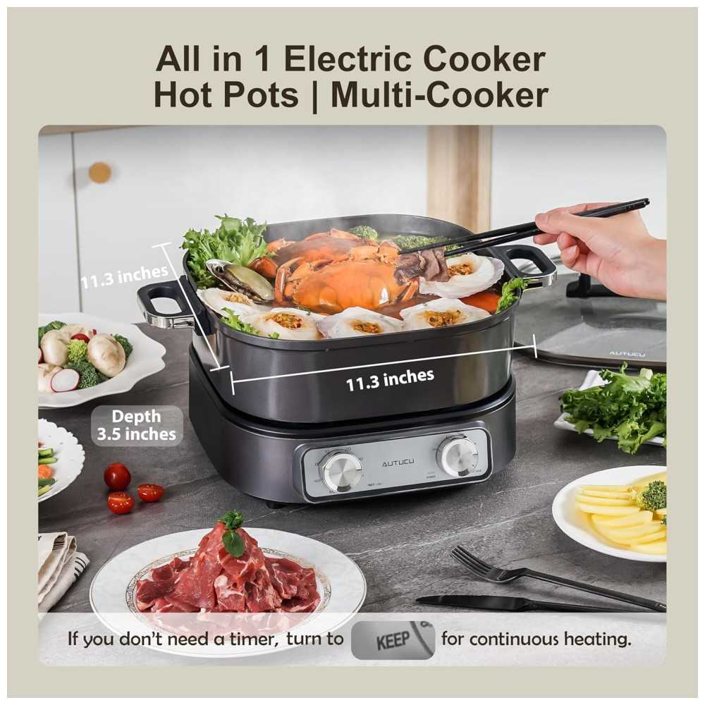 O MultiCooker Elétrico Autucu é um verdadeiro coringa na cozinha, podendo ser usado como panela elétrica, panela de sopa, frigideira elétrica, panela de cozimento lento e muito mais. Sua panela com revestimento cerâmico livre de PFOA, tanto interna quanto externamente, garante excelente liberação de alimentos e facilidade na limpeza. Com três níveis de potência (400W, 1200W e 1600W) e controle de temperatura e tempo, você pode aquecer, refogar e cozinhar a vapor com facilidade. Além disso, possui um design elegante e prático, com alças antitérmicas, tampa de vidro temperado, prevenção de vazamentos e oito clipes antiderrapantes no fundo. Cozinhe diretamente na panela, sem transferir para o fogão, evitando bagunças. O MultiCooker Autucu é um presente prático e elegante para amigos e adolescentes.