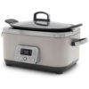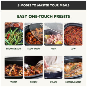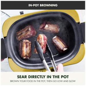 O sabor não acontece instantaneamente. Crie pratos saborosos e refeições em grande quantidade com sabores intensos. Nossa panela elétrica de cozimento lento cria sabores irresistíveis com o simples toque de um botão. Doure seus alimentos para começar, depois cozinhe em fogo baixo para extrair o máximo de sabor. Cozinhe lentamente, asse, doure/salteie e cozinhe no vapor com os ajustes fáceis de usar! Além disso, a tela LCD grande facilita a seleção da sua configuração. Tome seu tempo ao cozinhar e depois limpe rapidamente com Thermolon Volt, um revestimento cerâmico saudável especialmente projetado para aparelhos elétricos. A panela é removível para facilitar a limpeza e pode ir à lava-louças. REVESTIMENTO CERÂMICO ANTIADERENTE REVOLUCIONÁRIO Thermolon Volt, um revestimento cerâmico antiaderente especialmente projetado para resistir ao uso de eletrodomésticos modernos – este antiaderente de cerâmica infundido com diamante é extra resistente, fácil de limpar e torna qualquer refeição mais saudável. PANELA ANODIZADA REMOVÍVEL DE 5,68 LITROS A construção ultradurável torna esta panela segura para utensílios de metal e permite aquecimento extremamente rápido e uniforme. Além disso, a panela pode ser lavada na lava-louças para uma limpeza fácil. DOURAR NA PANELA Marrom, doure e refogue sua carne ou legumes diretamente na panela com o toque de um botão. CAPACIDADE DE 5,68 LITROS A ampla capacidade oferece muito espaço para grandes porções de alimentos, como 2,5 kg de paleta de porco, ou 8-10 coxas de frango. Perfeito para refeições em grande quantidade, multidões ou festas. 8 PREDEFINIÇÕES DE UM TOQUE PODEROSAS Cozinhe Lento, Refogue, Cozinhe no Vapor, Cozinhe em Fogo Brando, Mantenha Aquecido, Asse, Reaqueça, Alto, Baixo, Aqueça, tudo com o toque de um botão. LIVRE DE TOXINAS, SEM PFAS Nosso revestimento cerâmico antiaderente exclusivo é livre de PFAS, PFOA, chumbo ou cádmio para cozinhar sem preocupações e limpeza sem complicações. VISOR LCD DE FÁCIL LEITURA Um display XL com iluminação verde e pré-configurações de fácil acesso facilitam a escolha da configuração certa para a sua próxima refeição. INCLUI VAPOR DE AÇO INOXIDÁVEL Cozinhe no vapor dumplings, legumes, frango e muito mais diretamente na panela. TAMPA DE VIDRO TEMPERADO Observe sua refeição e veja os sabores se desenvolverem. LAVA-LOUÇAS Panela, tampa e vaporizador facilmente removíveis e podem ir à lava-louças para limpeza de sujeiras difíceis.