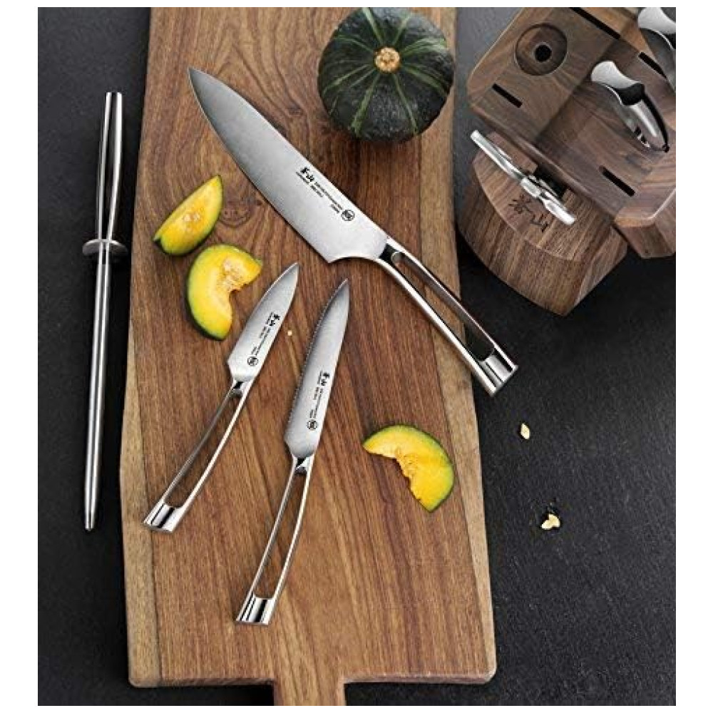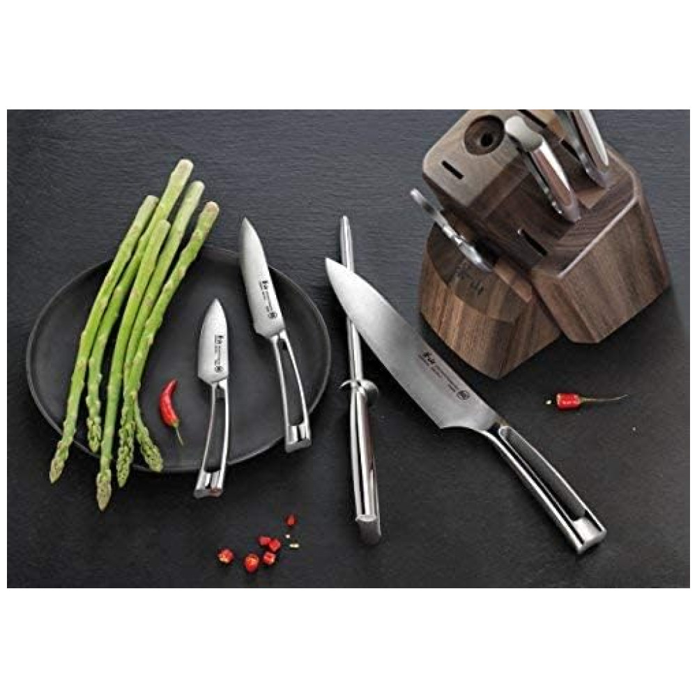 Projetado para ajudá lo a realizar uma variedade de tarefas de corte com facilidade e confiança, este conjunto inclui as facas de cozinha mais comuns, bem como algumas facas especiais para trabalhos de preparação mais avançados.