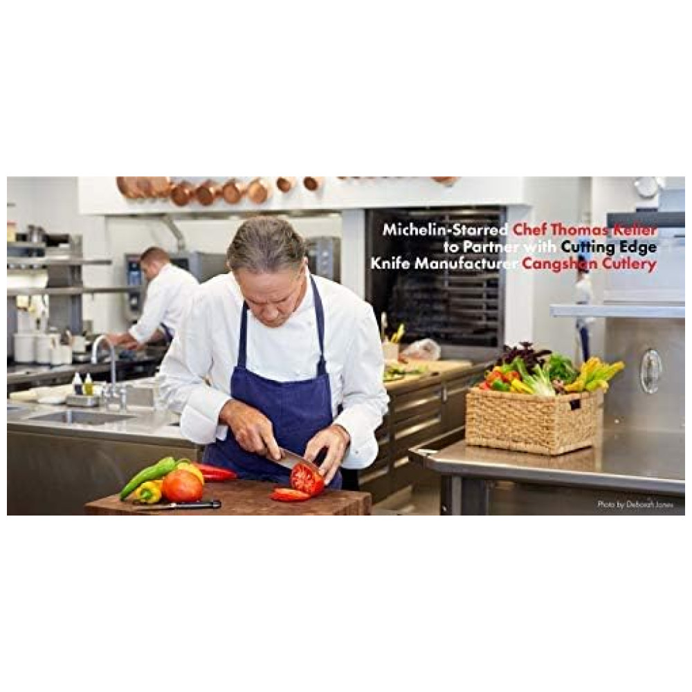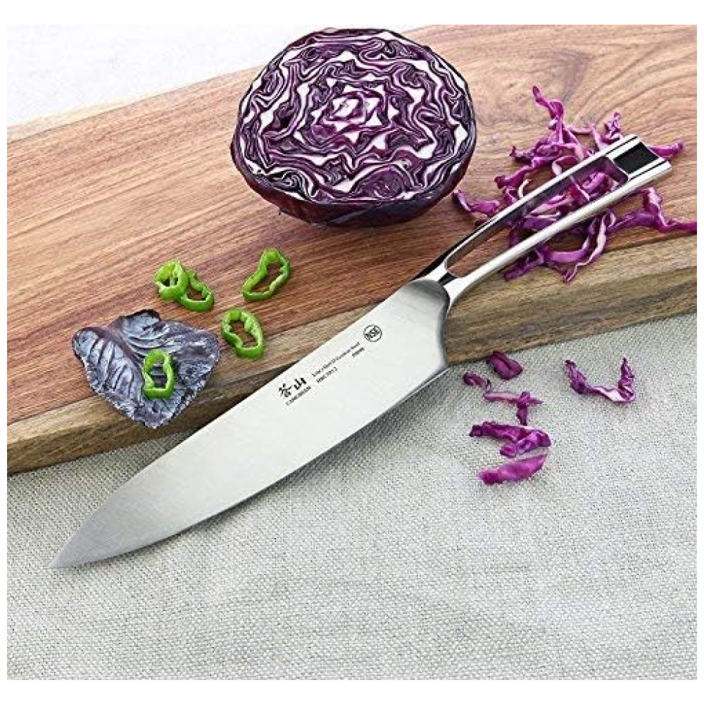 NSF International Certified. Garantia vitalícia contra defeitos de fabricante. Lave as facas com água morna e um pouco de detergente, enxágue com cuidado e seque com uma toalha