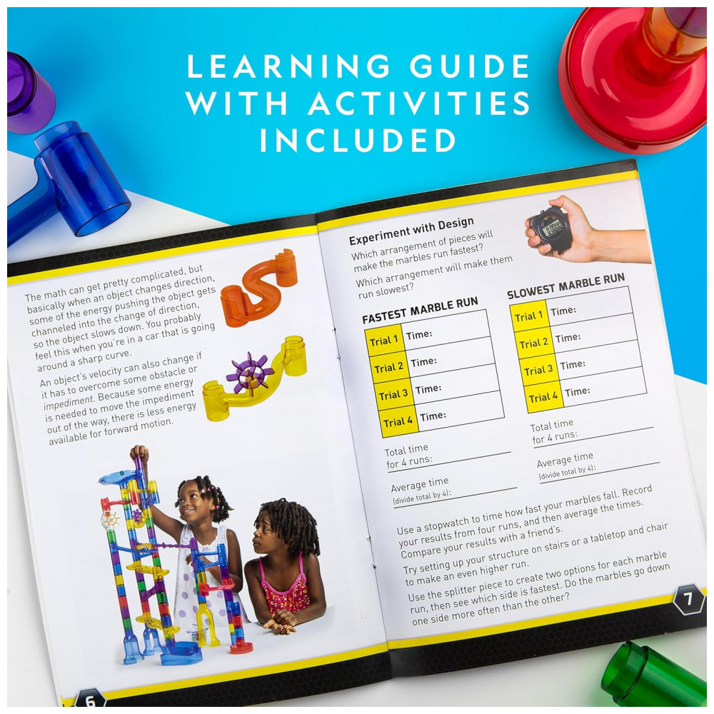 Conteúdo do kit: 85 tubos lisos, 26 peças de ação, 9 bases resistentes, 30 canicas de vidro que brilham no escuro, bolsa de armazenamento, guia de aprendizagem