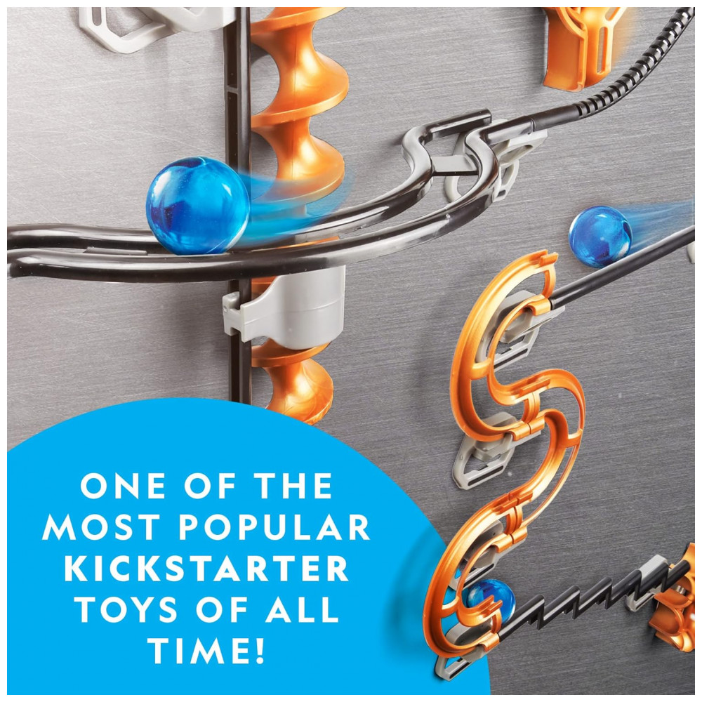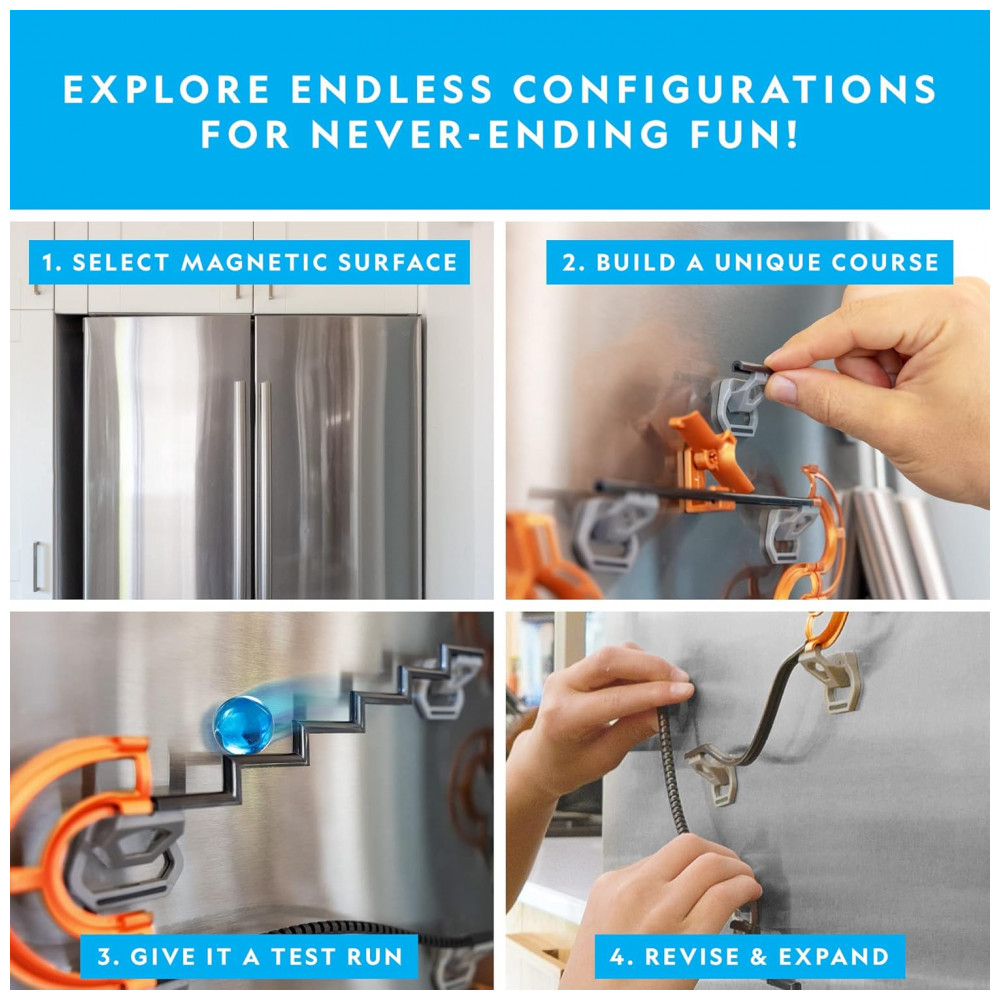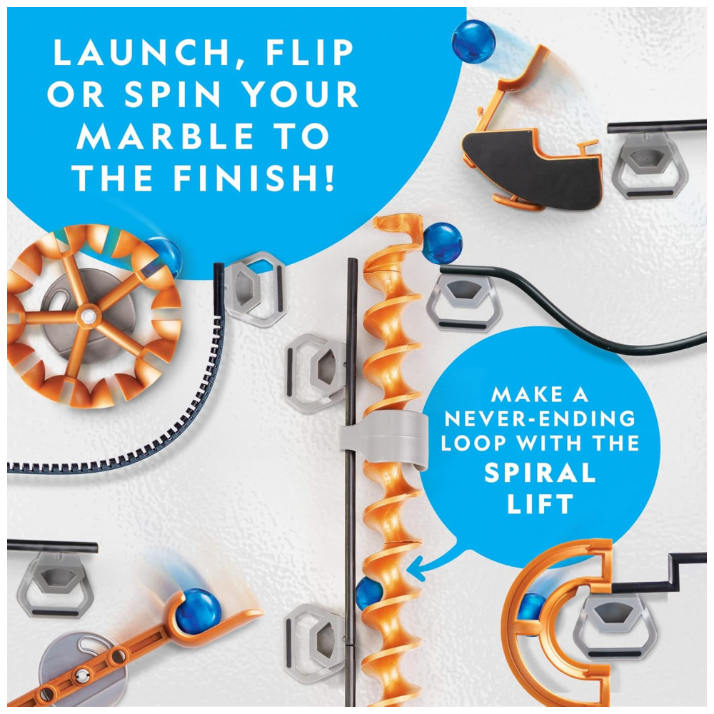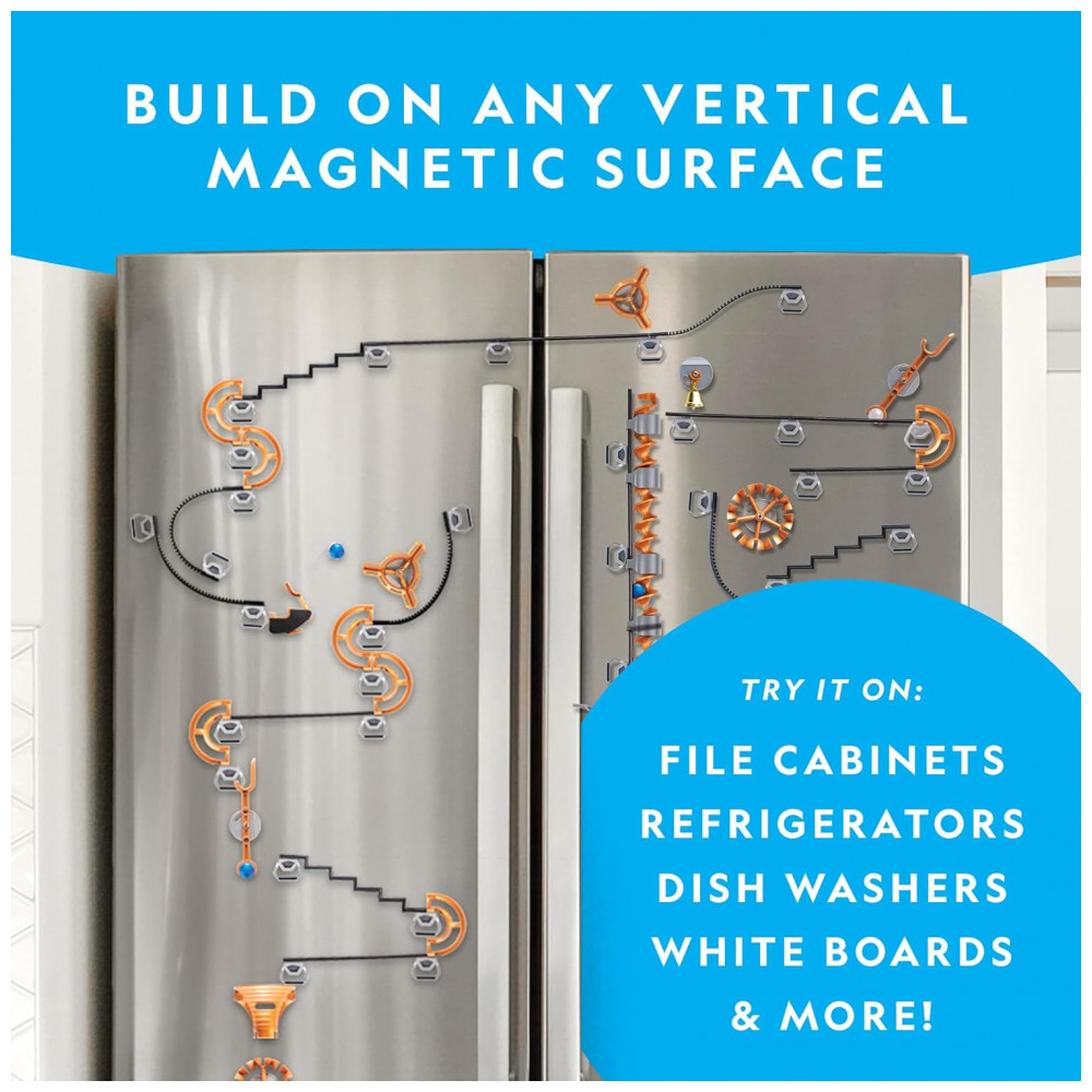 Este conjunto de construção magnética de mármore da marca Blue Marble, patenteado e apoiado por milhares no Kickstarter, é um verdadeiro sucesso! Com uma pista e truques únicos, você pode ajustar e adicionar novos caminhos emocionantes. Inclui elevador motorizado, 70 conectores de pista, 32 peças especiais, 25 mármores e muito mais para infinitas combinações e diversão criativa. Construa em superfícies magnéticas verticais, como geladeiras, armários e lousas. Conectores de encaixe seguro e instruções detalhadas tornam a montagem fácil. Vencedor do prêmio Toy of the Year Award!