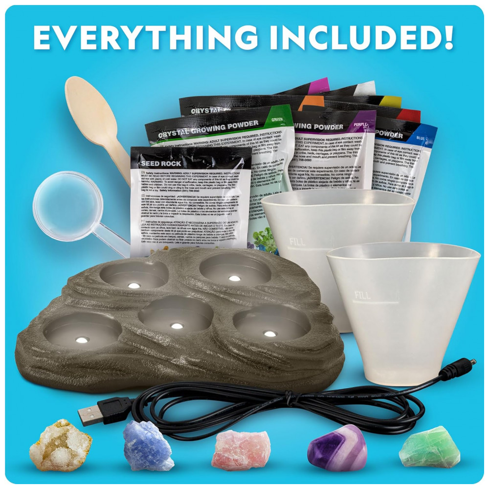 O kit inclui um suporte iluminado alimentado por USB, perfeito para exibir cinco dos cristais mais impressionantes e criar uma experiência visual deslumbrante. Além disso, contém cinco espécimes reais de cristais — quartzo, quartzo rosa, fluorita, calcita e ametista — permitindo que as crianças comecem ou expandam sua coleção de minerais enquanto aprendem sobre suas características. Cada detalhe do kit é projetado para inspirar o interesse pela ciência e pelo mundo natural, tornando-o um presente educativo ideal para meninos e meninas entre 8 e 12 anos.