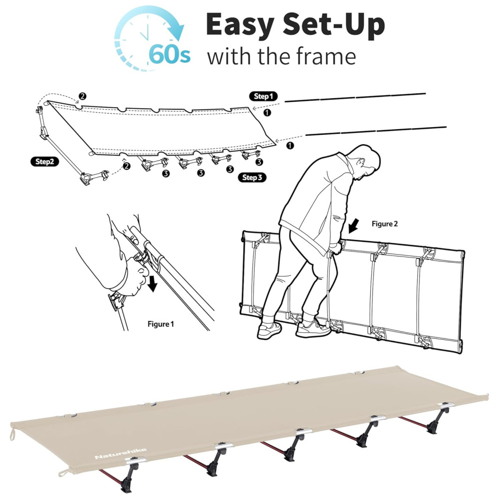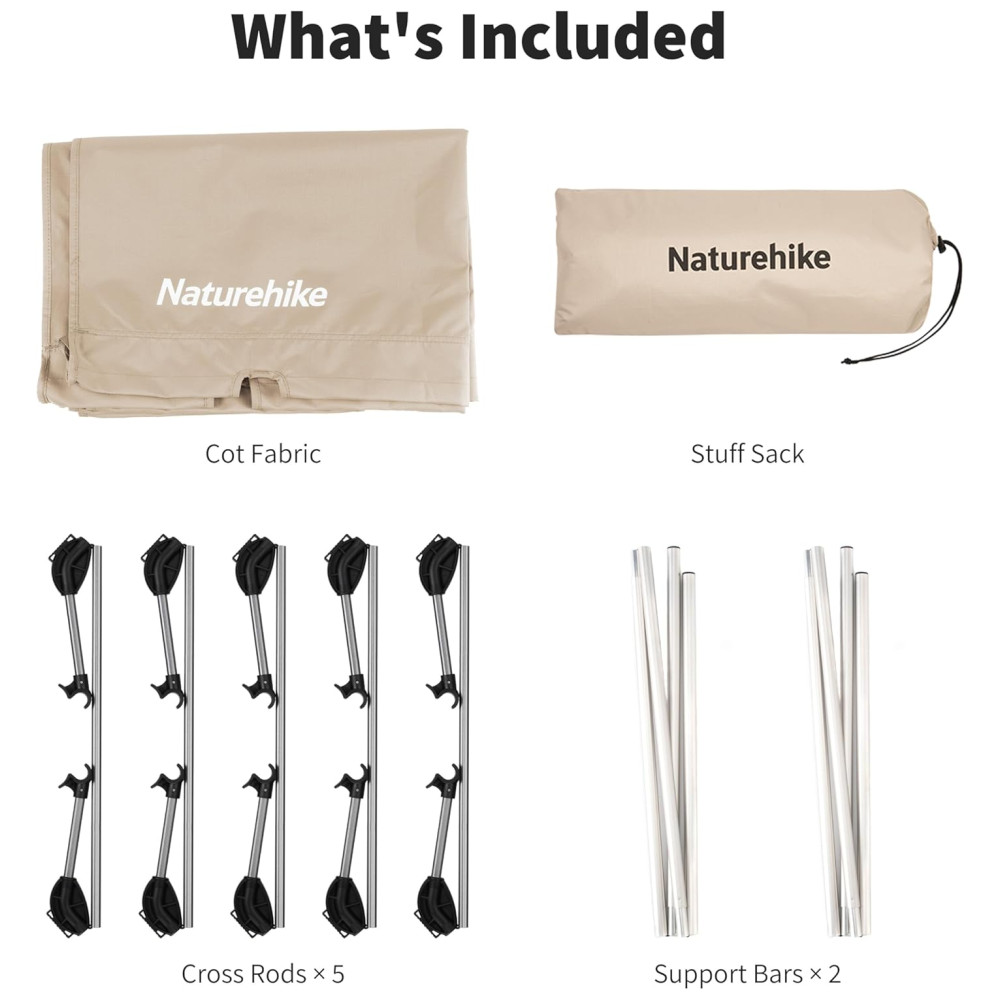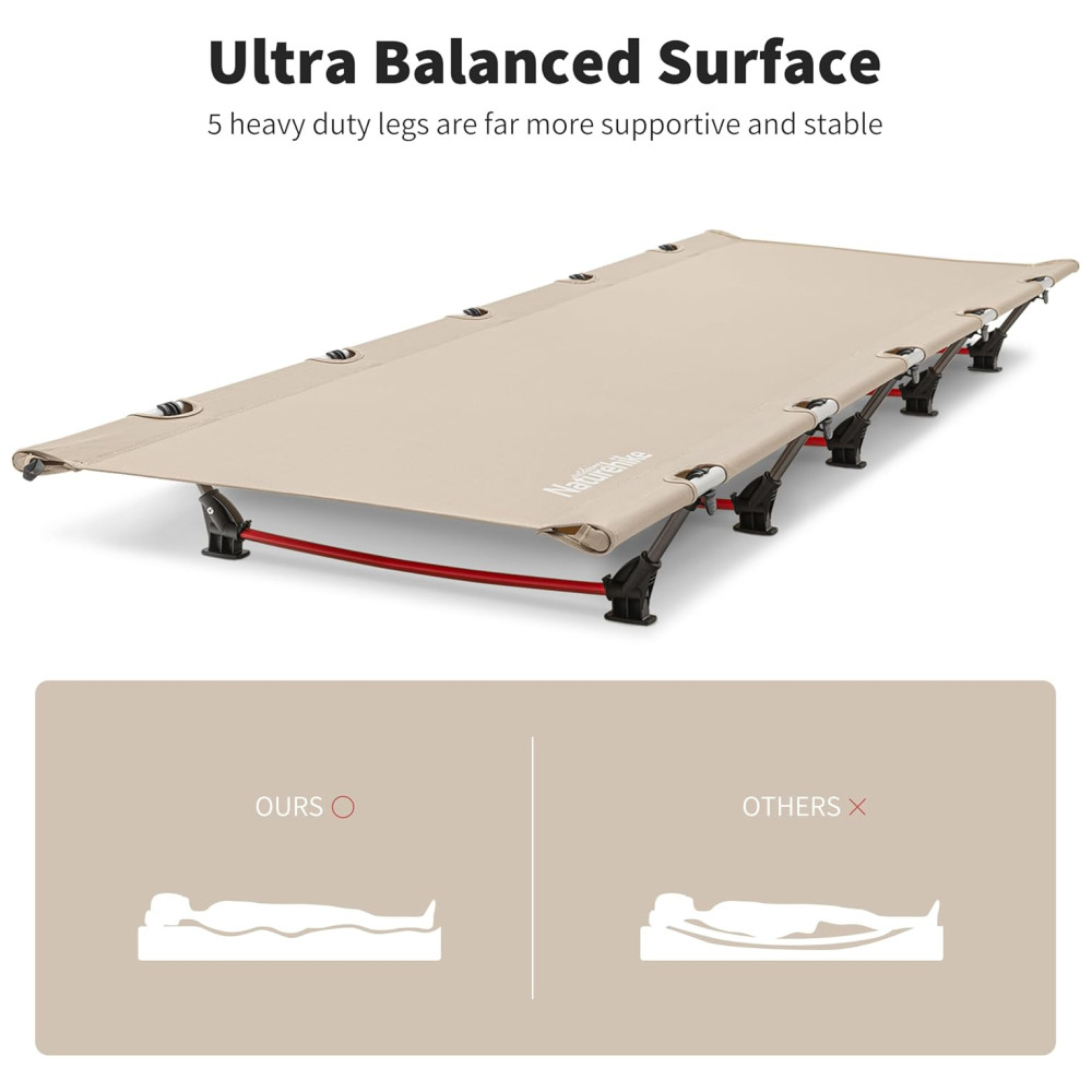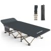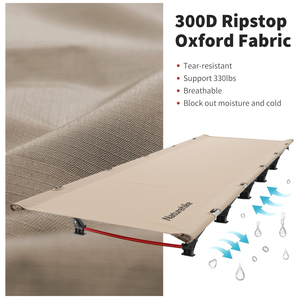 ROBUSTO E CONFORTÁVEL Suporta até 330lbs. Tubos de aço de alta resistência exclusivos e design de estrutura triangular. O tecido oxford ripstop respirável não apenas resistente à sujeira, mas também fácil de limpar. Berço de campismo dobrável leve para adultos mais confortável.