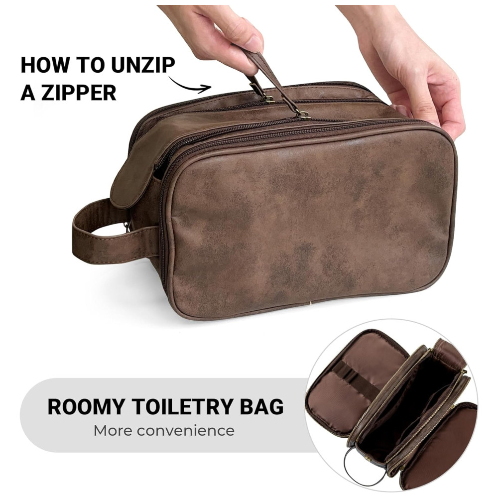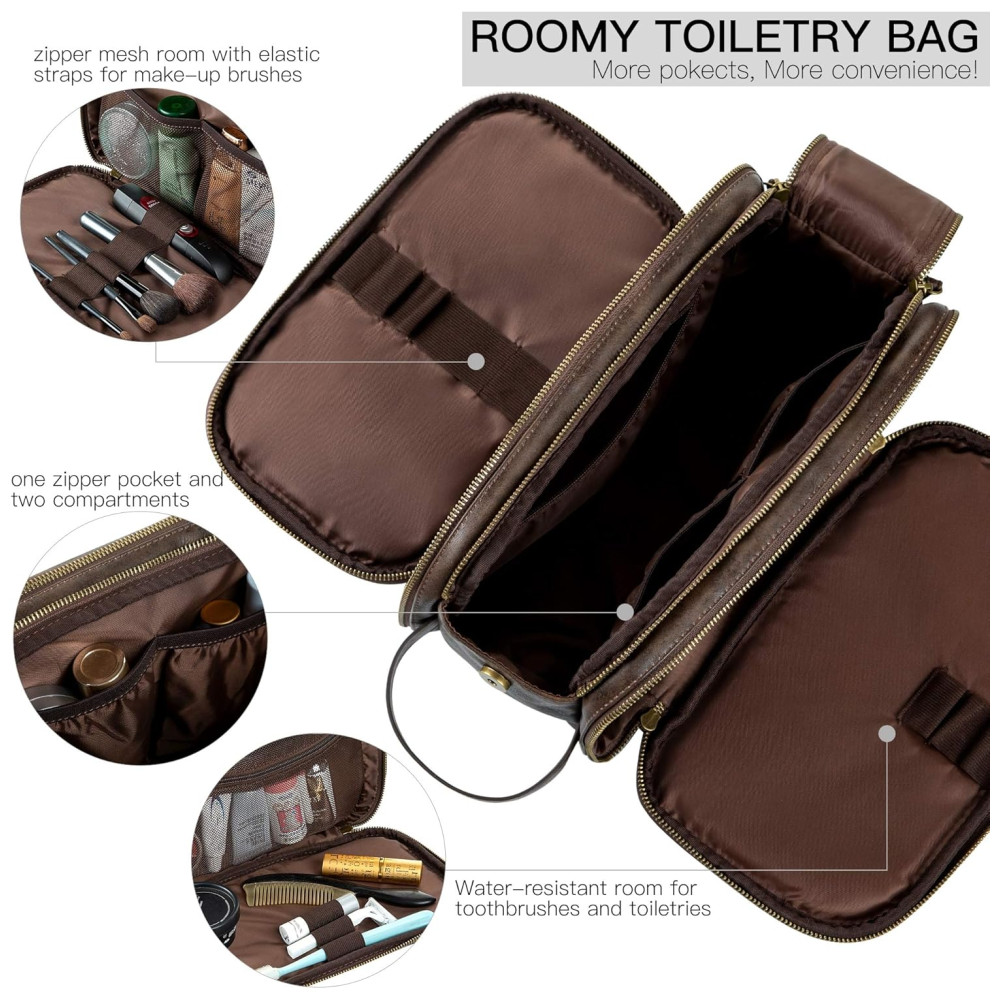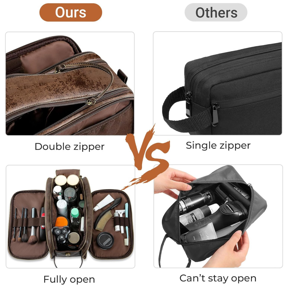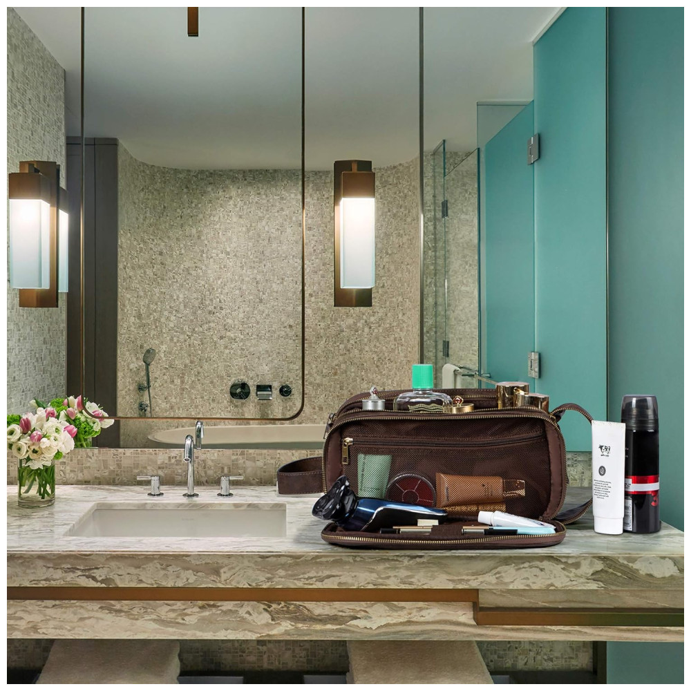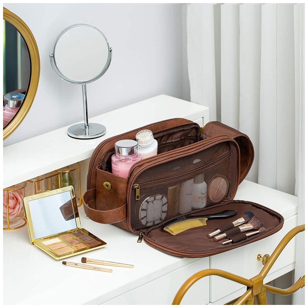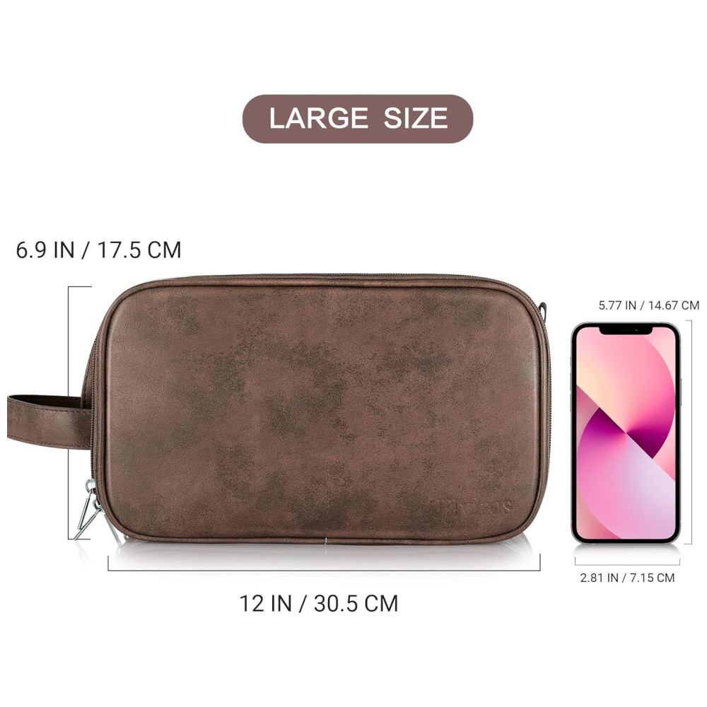 MATERIAL DURÁVEL À RESISTÊNCIA À ÁGUA Excepcionalmente bem construída, a bolsa de higiene é feita de couro PU, forro de náilon resistente à água para manter a umidade fora da bolsa. Zíper premium e costuras reforçadas também são implementados para desempenho de longa duração