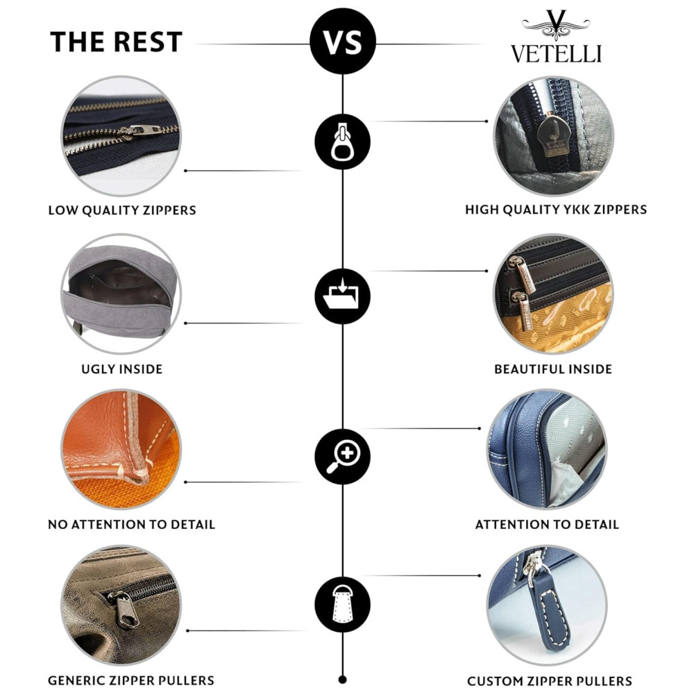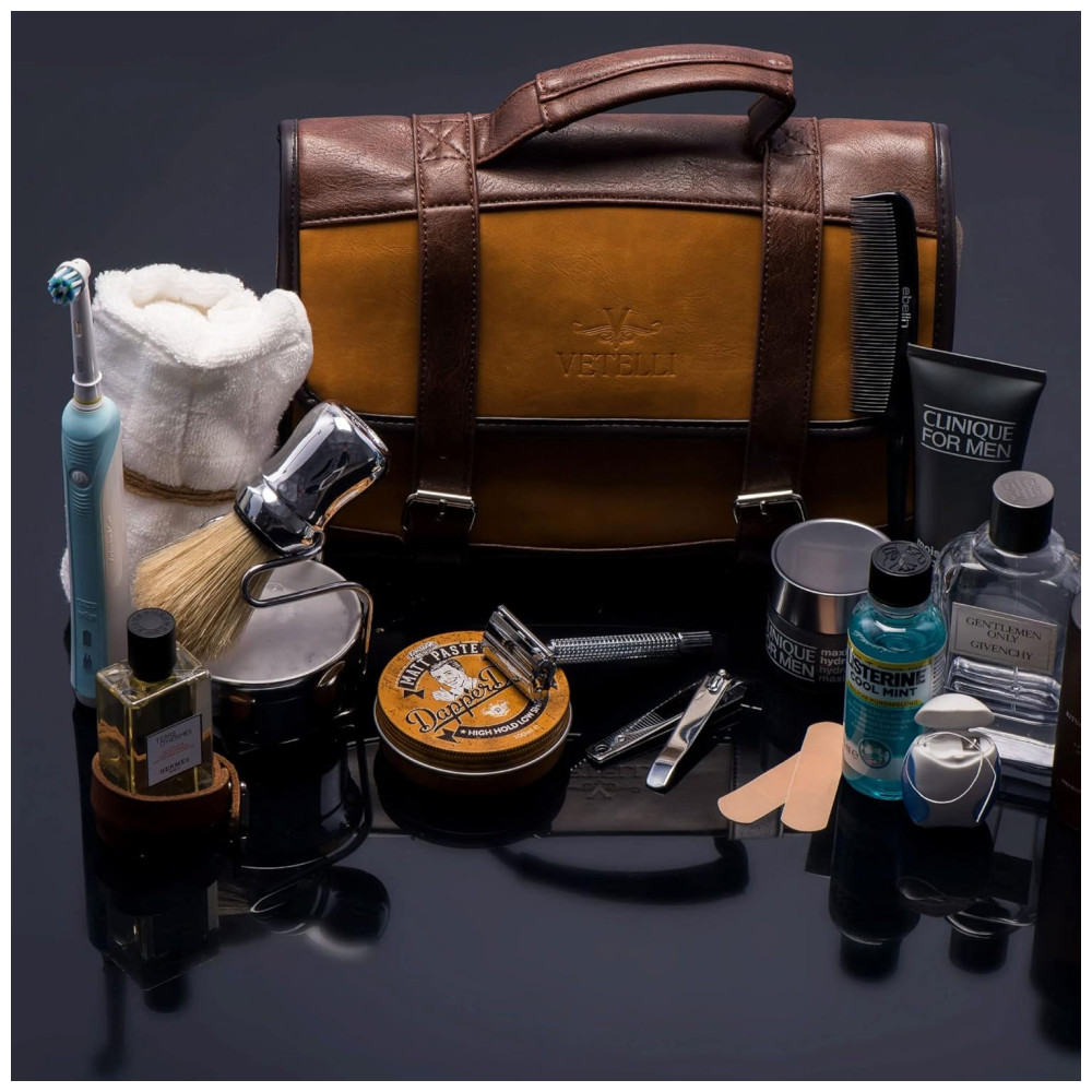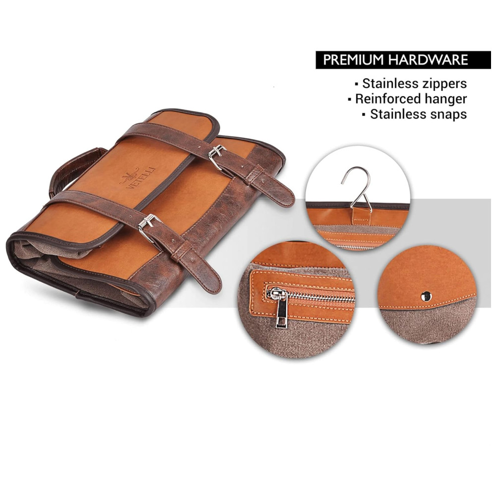 Resistente à água O Vetelli Dopp Kit é feito de couro PU de alta qualidade, que é fácil de limpar e resistente à água. O interior da bolsa combina couro PU com uma lona resistente para resistir a derramamentos e vazamentos e prevenir danos durante a viagem