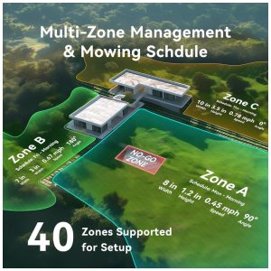 Com fusão de visão e tecnologia espacial, suporta mapeamento de bordas em até 3000 m² com precisão centimétrica, permitindo personalizar até 40 zonas de trabalho via app, incluindo áreas proibidas como piscinas e canteiros. O sistema de evasão de obstáculos baseado em IA, com banco de dados avançado e 360° de laser+visão, detecta objetos de 15 cm de altura e 1 cm de largura, com erro de posicionamento inferior a 2 cm e cobertura de 95%.