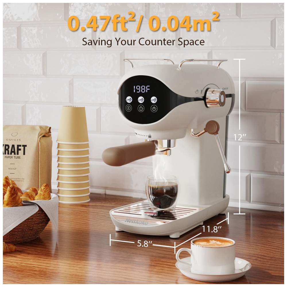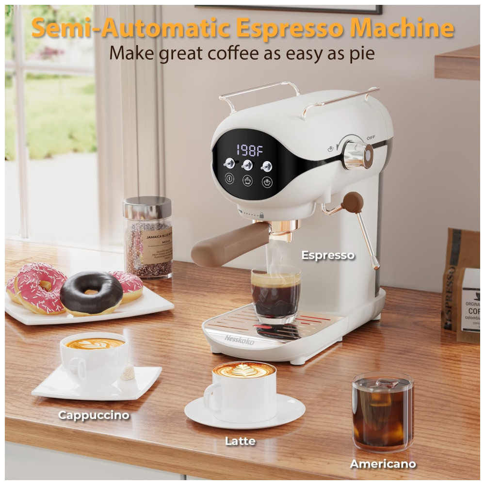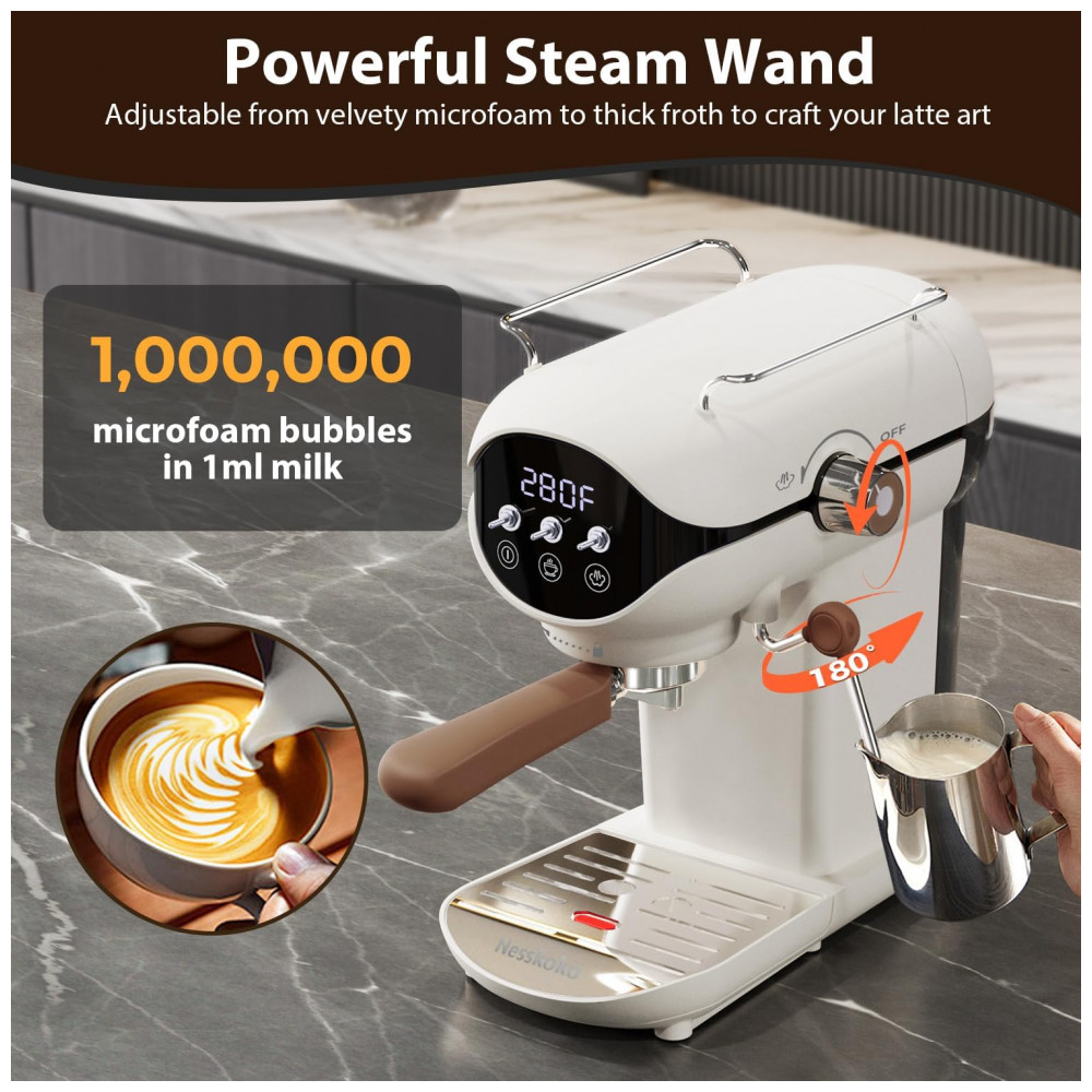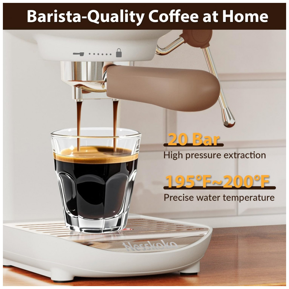 Nesskoko Máquina de Espresso Semi Automática Compacta 20 Bar com Vaporizador de Leite Branca