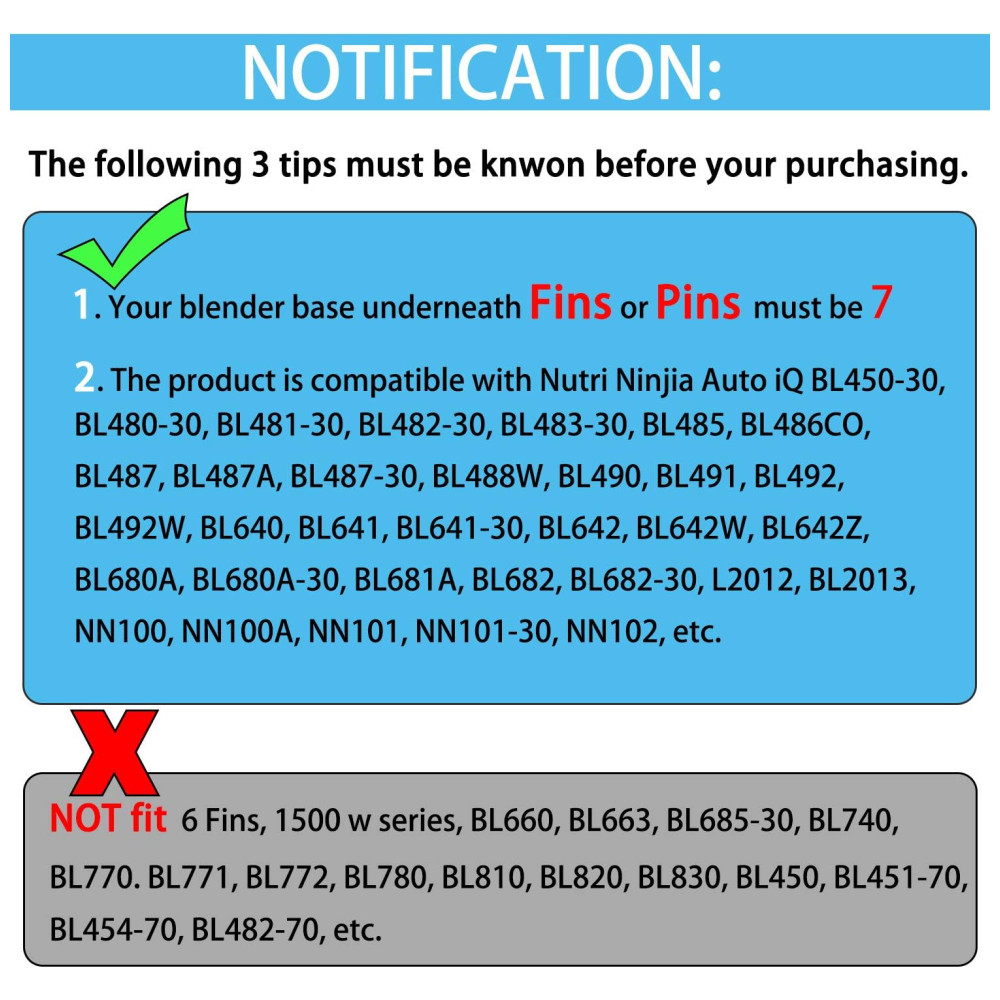 Modelo Compatível:A lâmina extratora de 7 aletas da AxPower é compatível com Nutri Ninja Auto-iQ: nn100,nn100a,nn101,nn101-30,nn102,nn210,bl450-30,bl454q,bl480-30,bl481-30,bl482-30,bl483-30,bl485,bl486co,bl487,bl487a,bl487t,bl488w,bl490,bl491,bl492,bl492w,bl493,bl494,bl494c,bl641,bl680a,bl680a-30,bl682,bl682-30,bl682w,bl487co,bl2012,bl2013,ct640,ct641,ct680,ct680a,ct680w,ct680ss,etc. (Apenas compatível com copos de 532 ml, 710 ml, 946 ml).