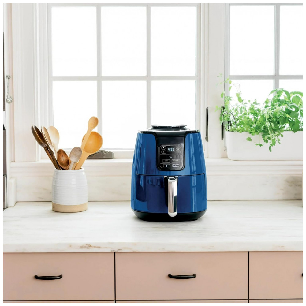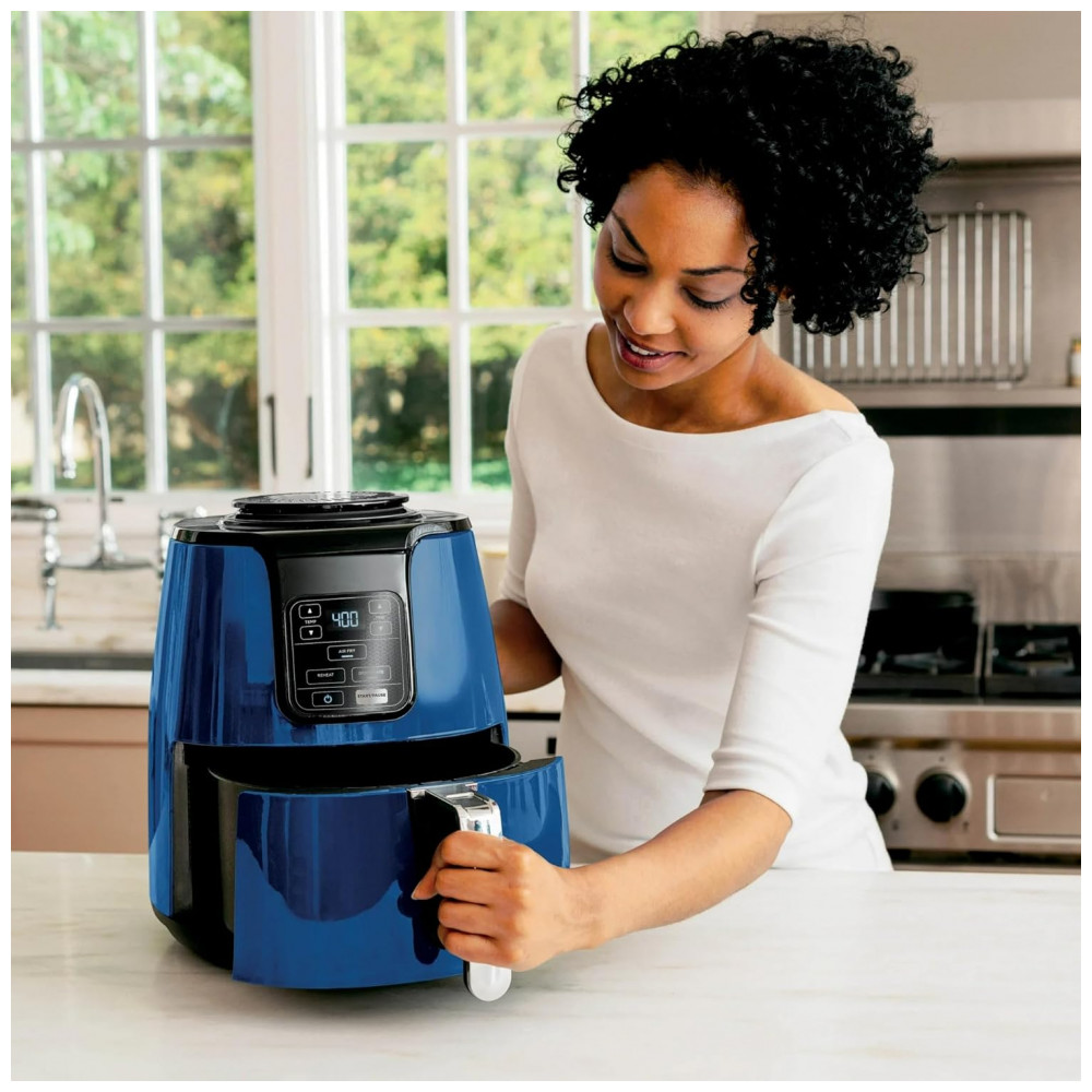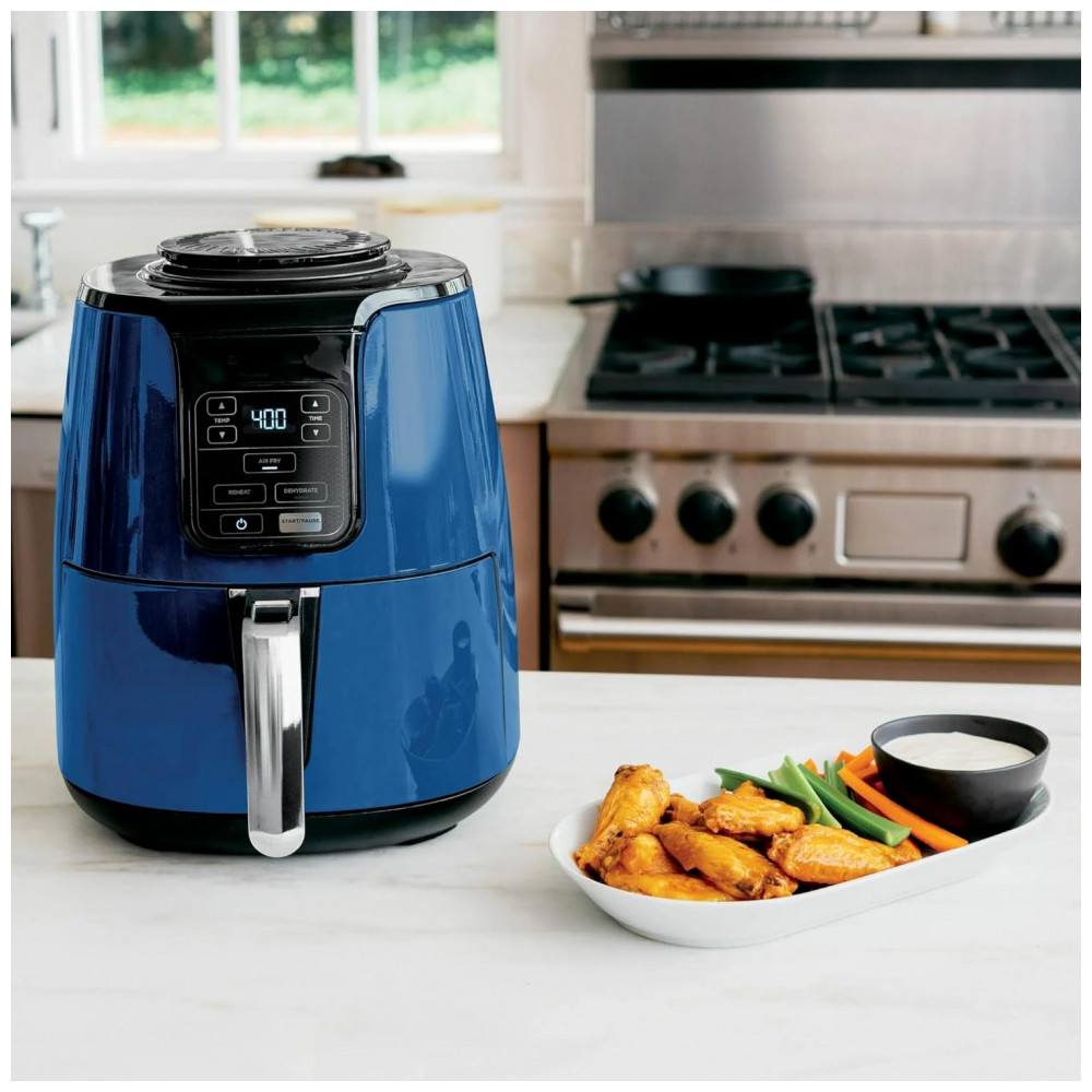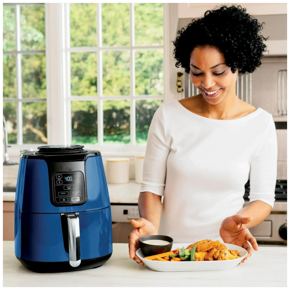A cesta e placa crispi são compatíveis com lava-louças para limpeza simplificada, enquanto o exterior em plástico e metal permite higienização rápida. Inclui desligamento automático e recursos como função Dehydrate para preparos versáteis.