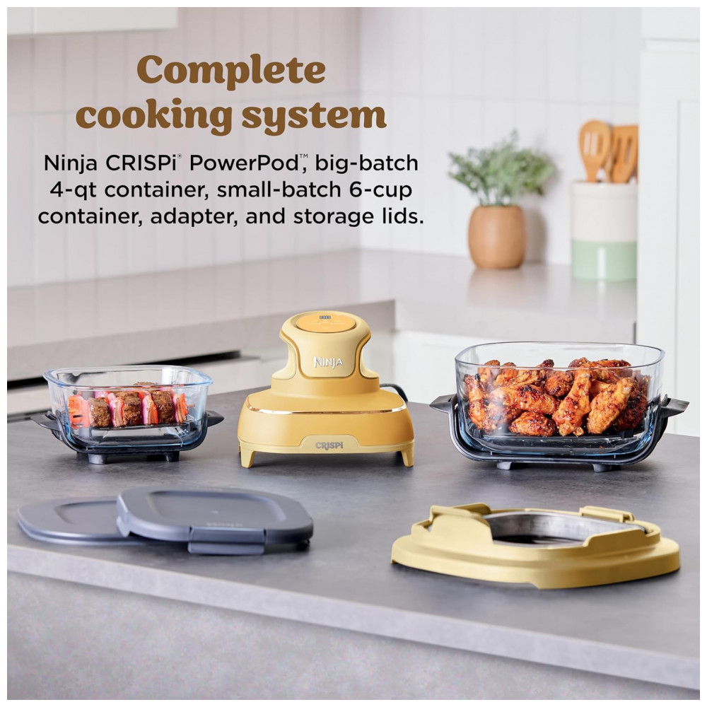 O Sistema All-in-One da Ninja inclui o Ninja Crispi PowerPod, contêineres de vidro CleanCrisp de 3,78 litros e 6 copos, um adaptador de contêiner, 2 tampas de armazenamento e 2 placas crocantes. O PowerPod Crispi oferece o poder de uma fritadeira de ar em tamanho normal na palma da sua mão. Os contêineres de 6 copos preparam uma refeição pessoal em 7 minutos, enquanto o de 3,78 litros é ideal para um frango e vegetais. Feito de vidro borossilicato resistente a choques térmicos, permitindo passar de congelado a crocante em minutos. Funcionalidade 4 em 1: Max Crisp, Assar, Air Fry e Recrisp. Proteção térmica fixa que permite colocar com segurança em diversos tipos de superfície. Tampas com trava para evitar vazamentos durante o transporte. Fácil de armazenar, com aninhamento dos contêineres e do PowerPod para uma organização sem bagunça. Adaptador de contêiner Crispi incluso para uso no contêiner maior.
